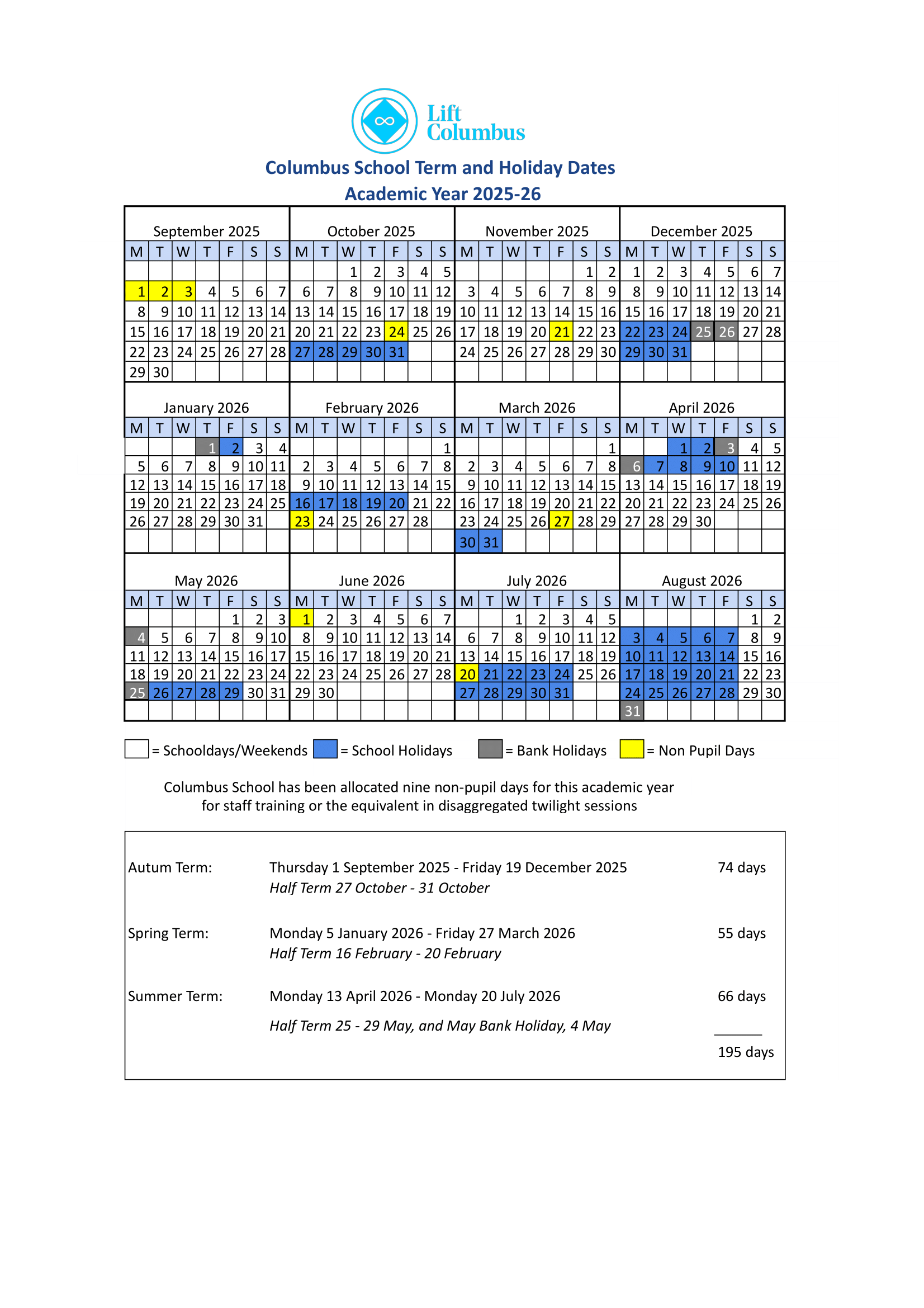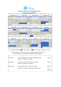The school Term Dates shown on this page has been sourced directly from the official Columbus School and College Term Dates website. Please be aware that all dates and events may be amended at the discretion of the school or local council. For the most up-to-date and accurate information, we recommend checking the official council website or contacting the school office.