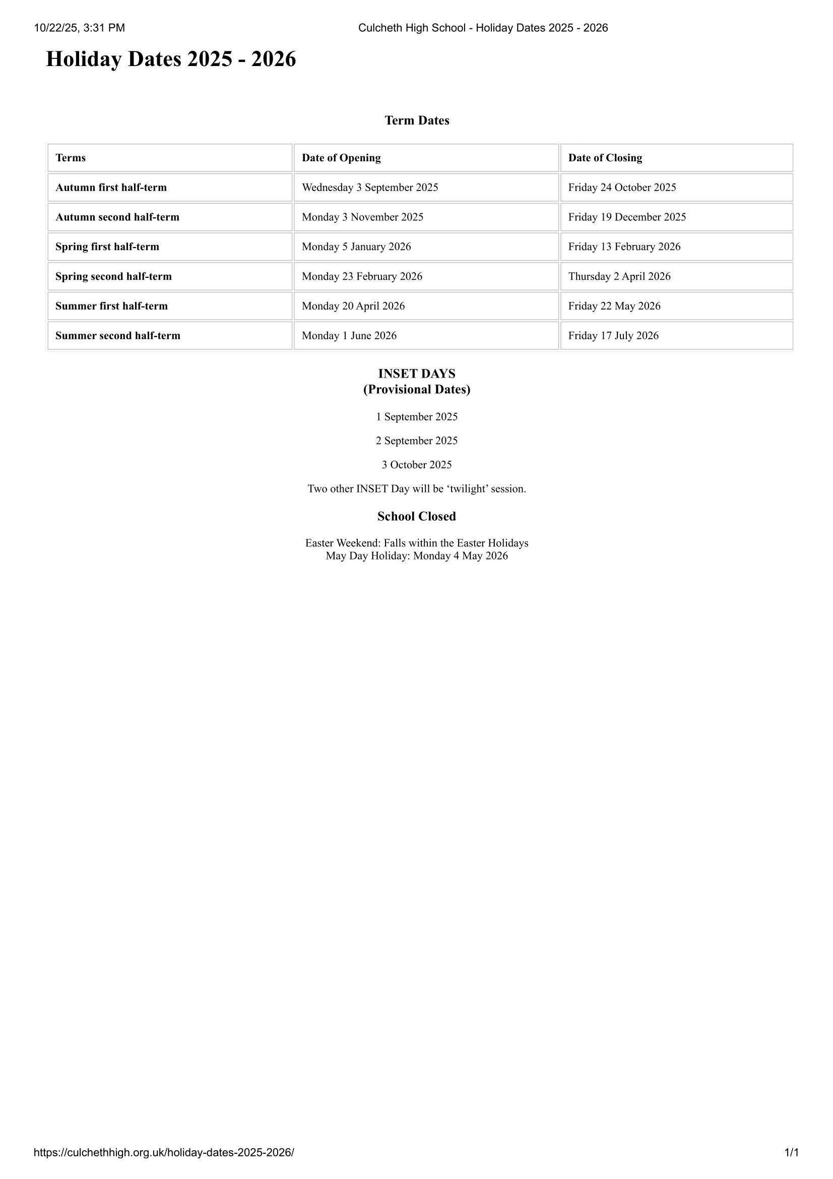 Culcheth High School — Term Dates FAQ (2025–2026)