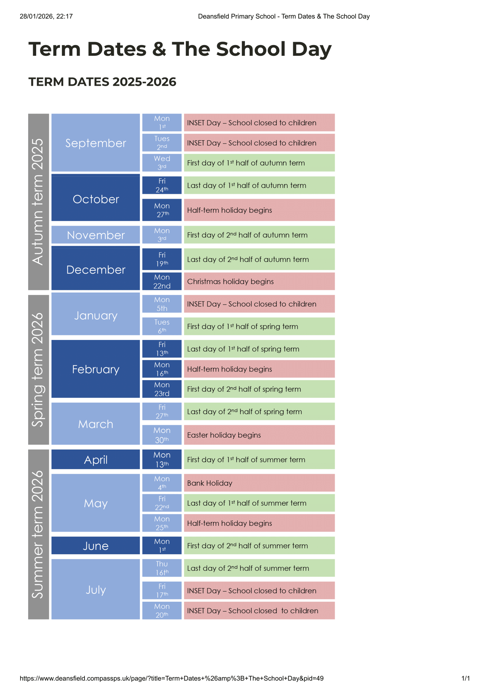 The school Term Dates shown on this page has been sourced directly from the official Deansfield Primary School Term Dates 25-26 Updates website. Please be aware that all dates and events may be amended at the discretion of the school or local council. For the most up-to-date and accurate information, we recommend checking the official council website or contacting the school office.