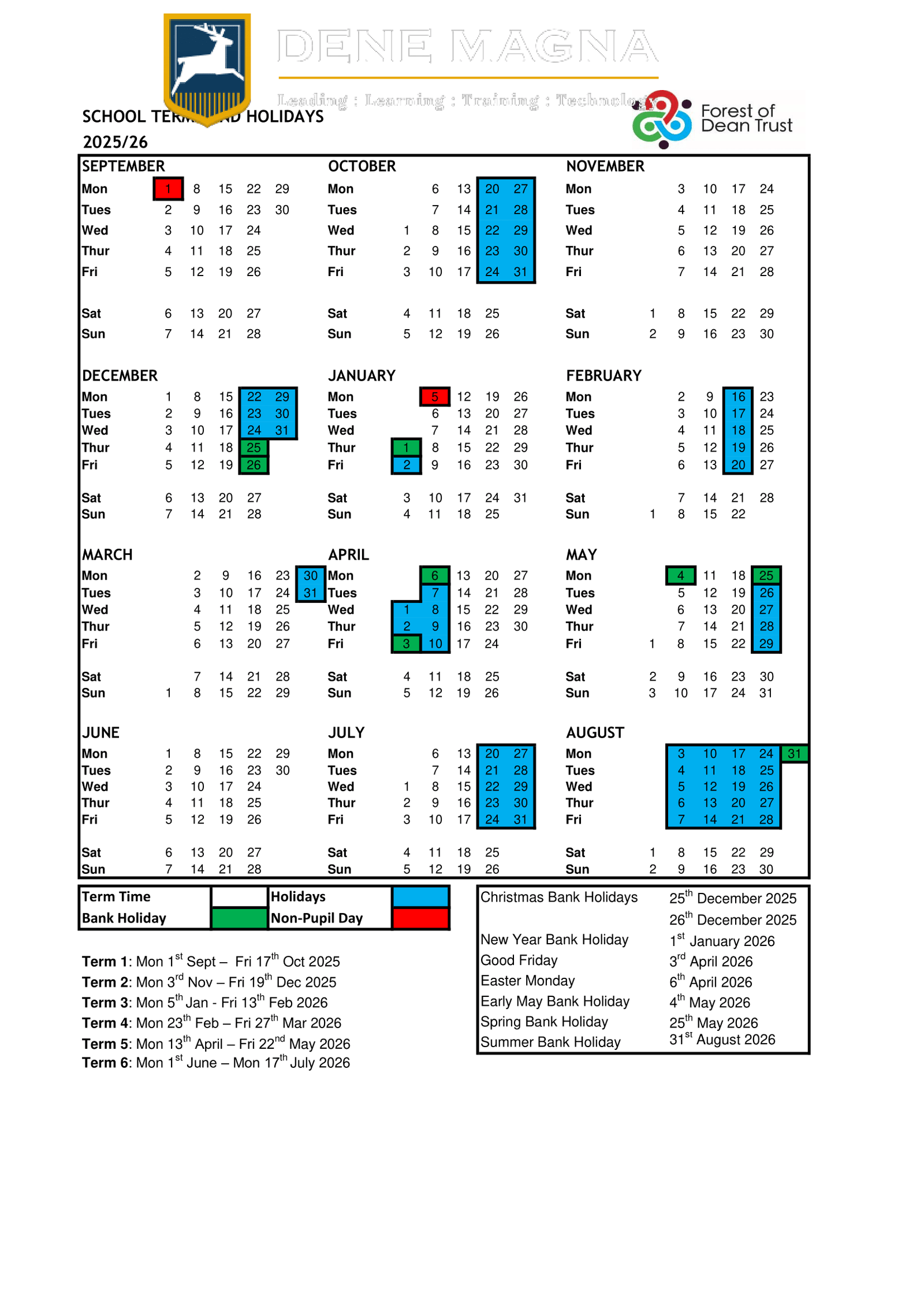 The school Term Dates shown on this page has been sourced directly from the official Dene Magna School Term Dates website. Please be aware that all dates and events may be amended at the discretion of the school or local council. For the most up-to-date and accurate information, we recommend checking the official council website or contacting the school office.