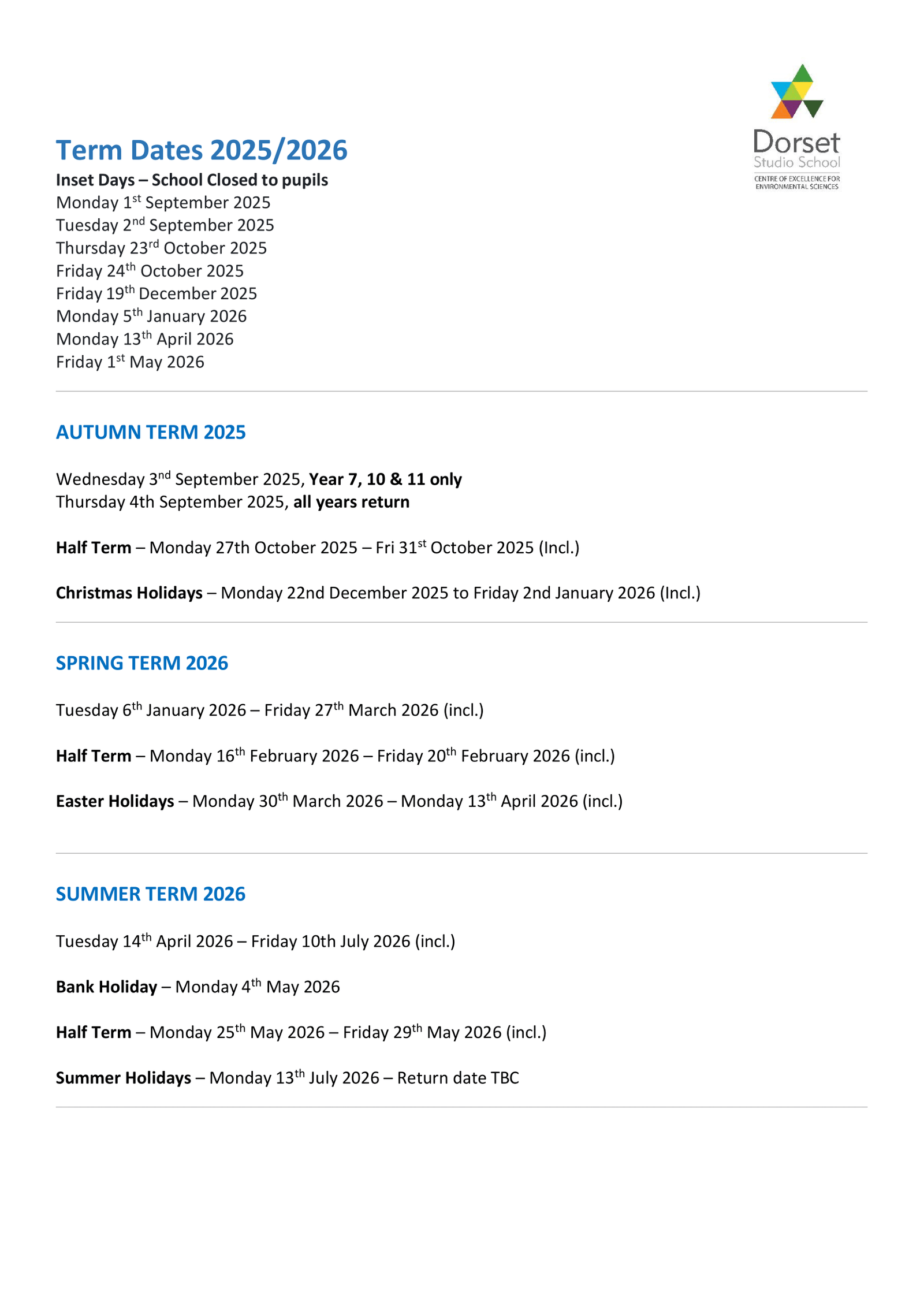 The school Term Dates shown on this page has been sourced directly from the official Dorset Studio School Term Dates Updates website. Please be aware that all dates and events may be amended at the discretion of the school or local council. For the most up-to-date and accurate information, we recommend checking the official council website or contacting the school office.