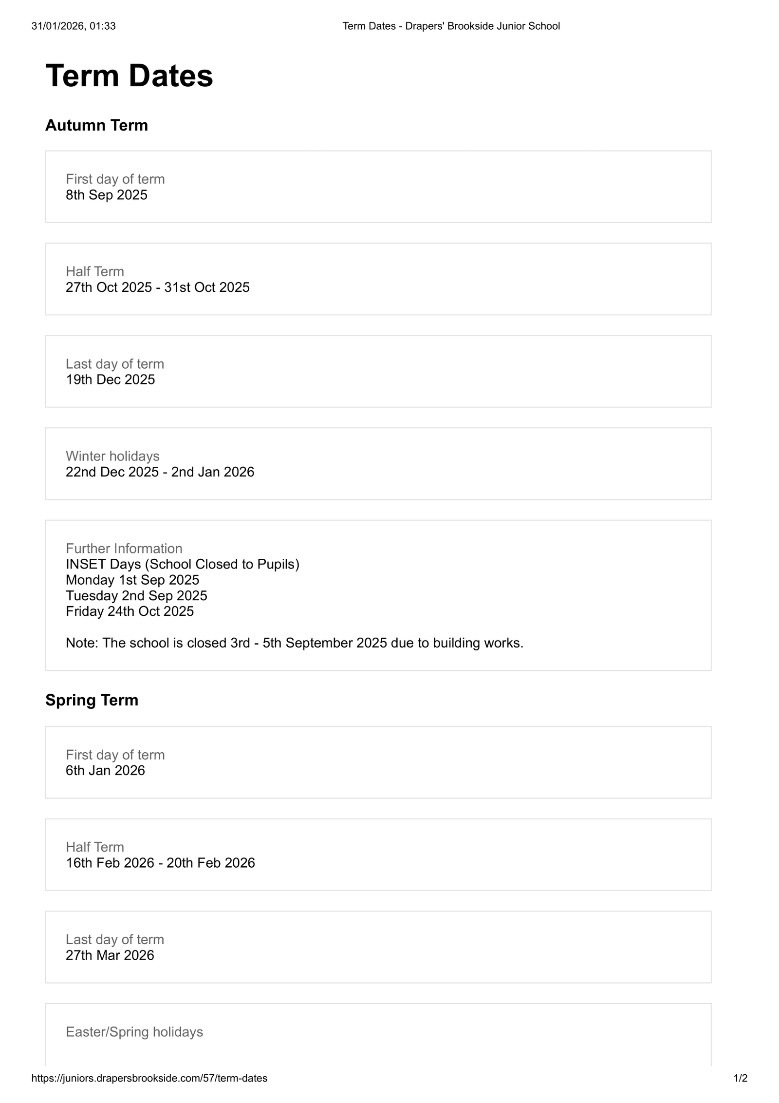 The Spring Term starts on Tuesday 6th January 2026 and ends on Friday 27th March 2026.