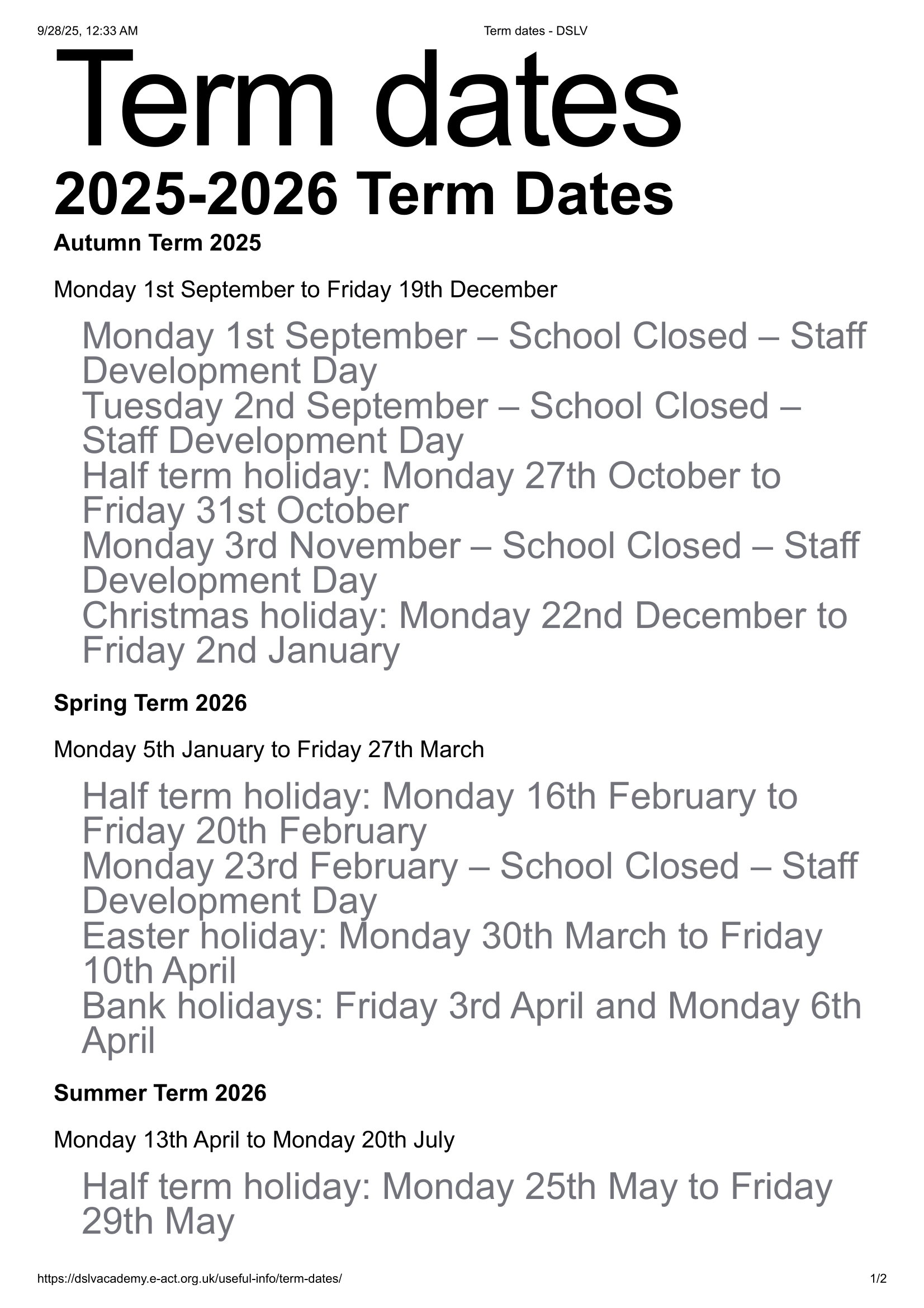 DSLV Term dates (2025-2026)