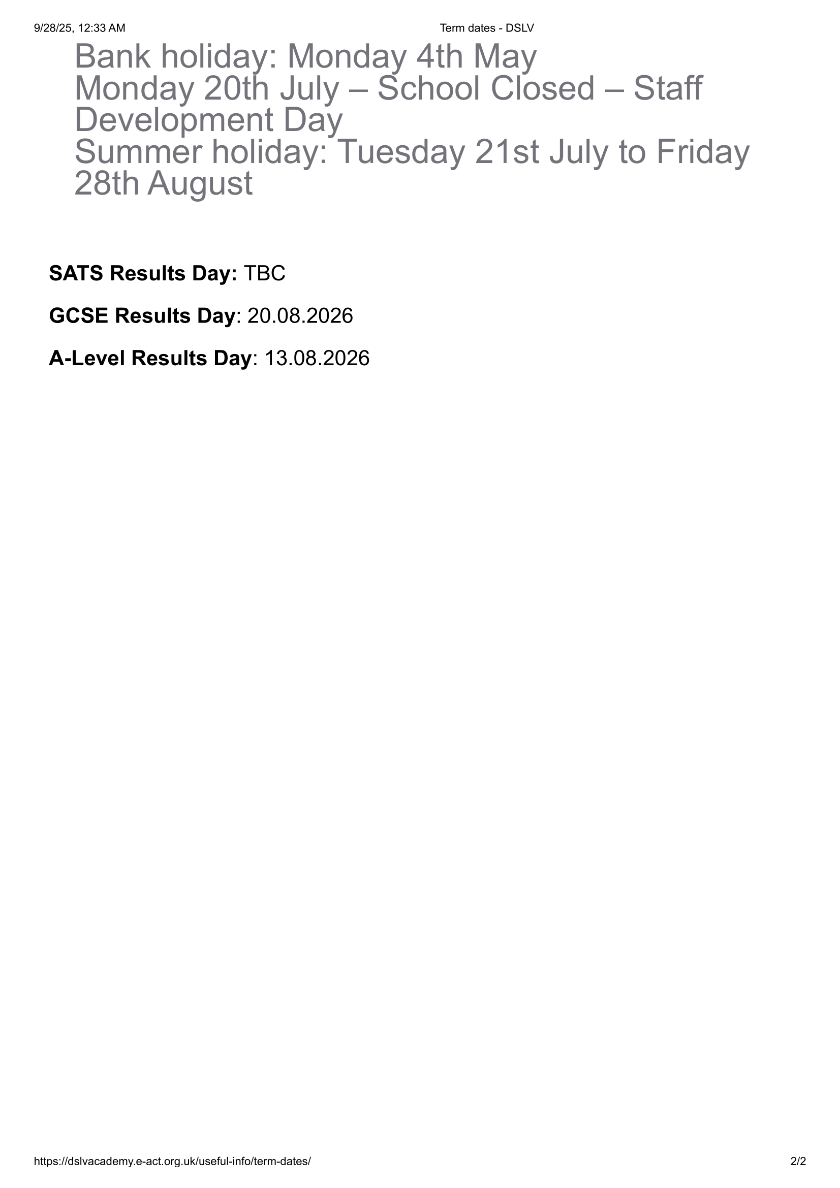 The school Term Dates shown on this page has been sourced directly from the official E-ACT DSLV term dates website. Please be aware that all dates and events may be amended at the discretion of the school or local council. For the most up-to-date and accurate information, we recommend checking the official council website or contacting the school office.