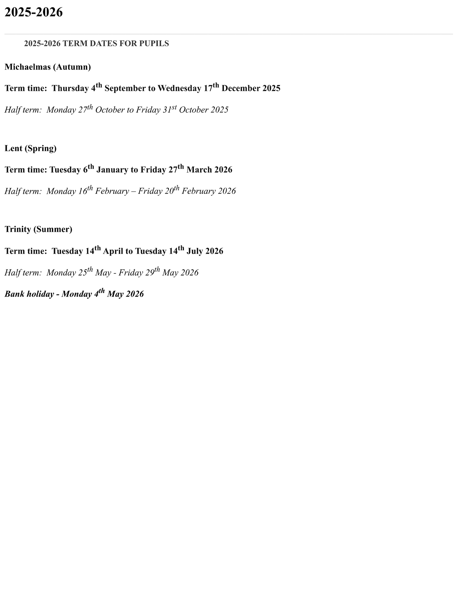 The Spring Term (Lent) runs from Tuesday 6 January 2026 to Friday 27 March 2026.