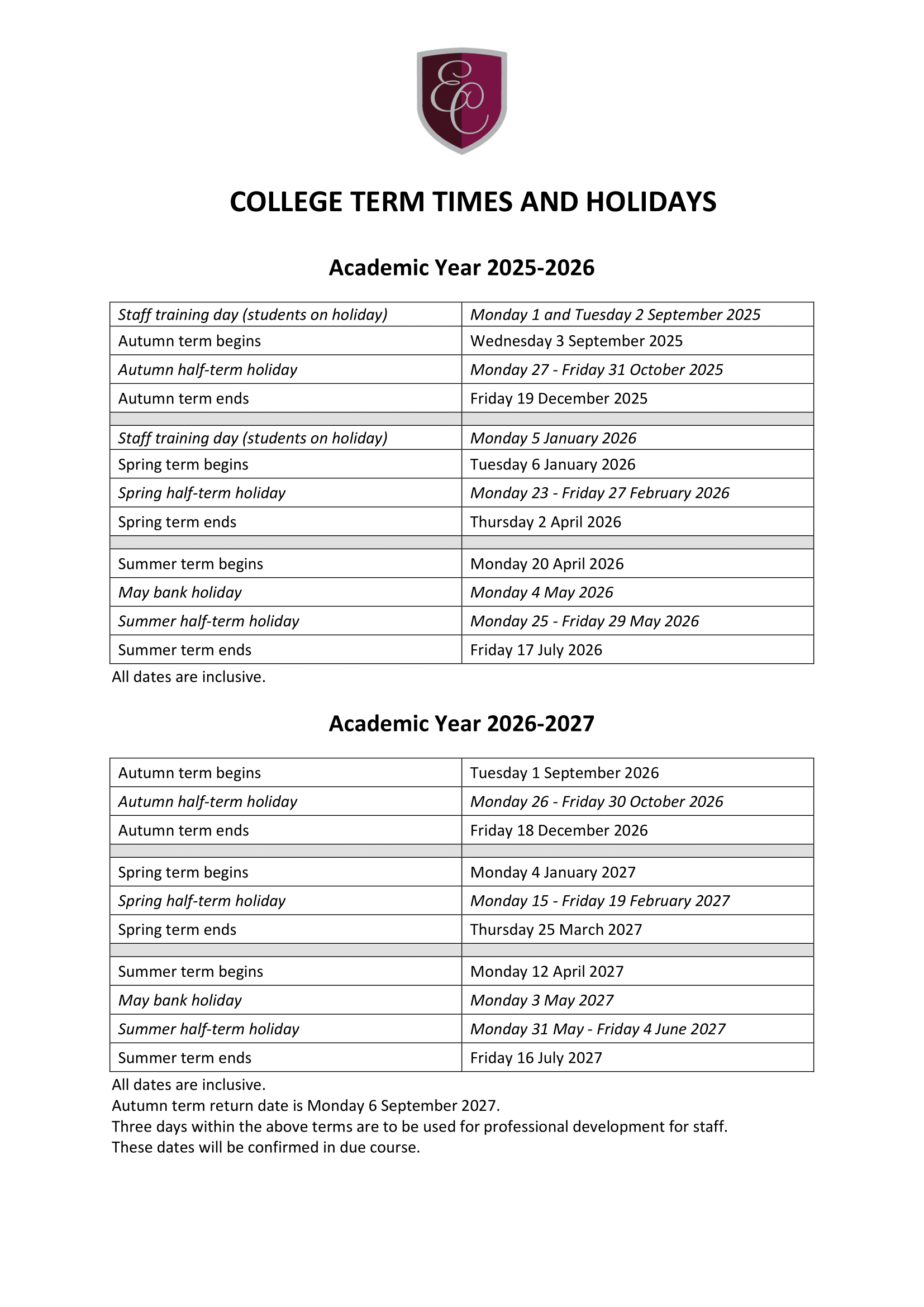 Source: College Term Times and Holidays sheet provided (dates shown are those printed on the calendar; all dates stated as “inclusive” on the sheet are treated as inclusive).
