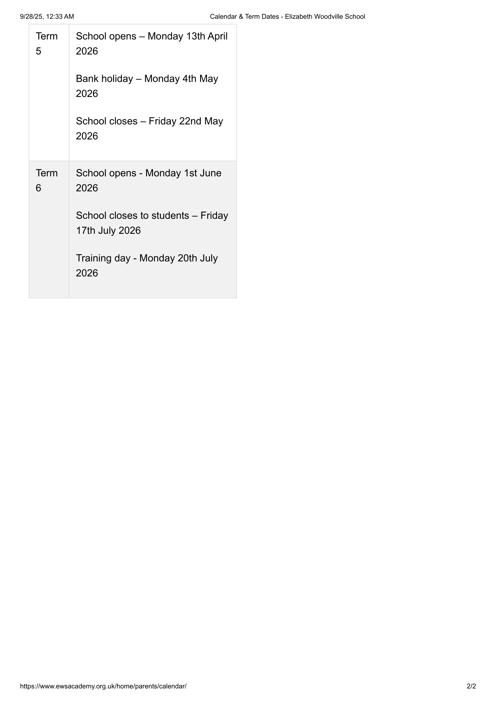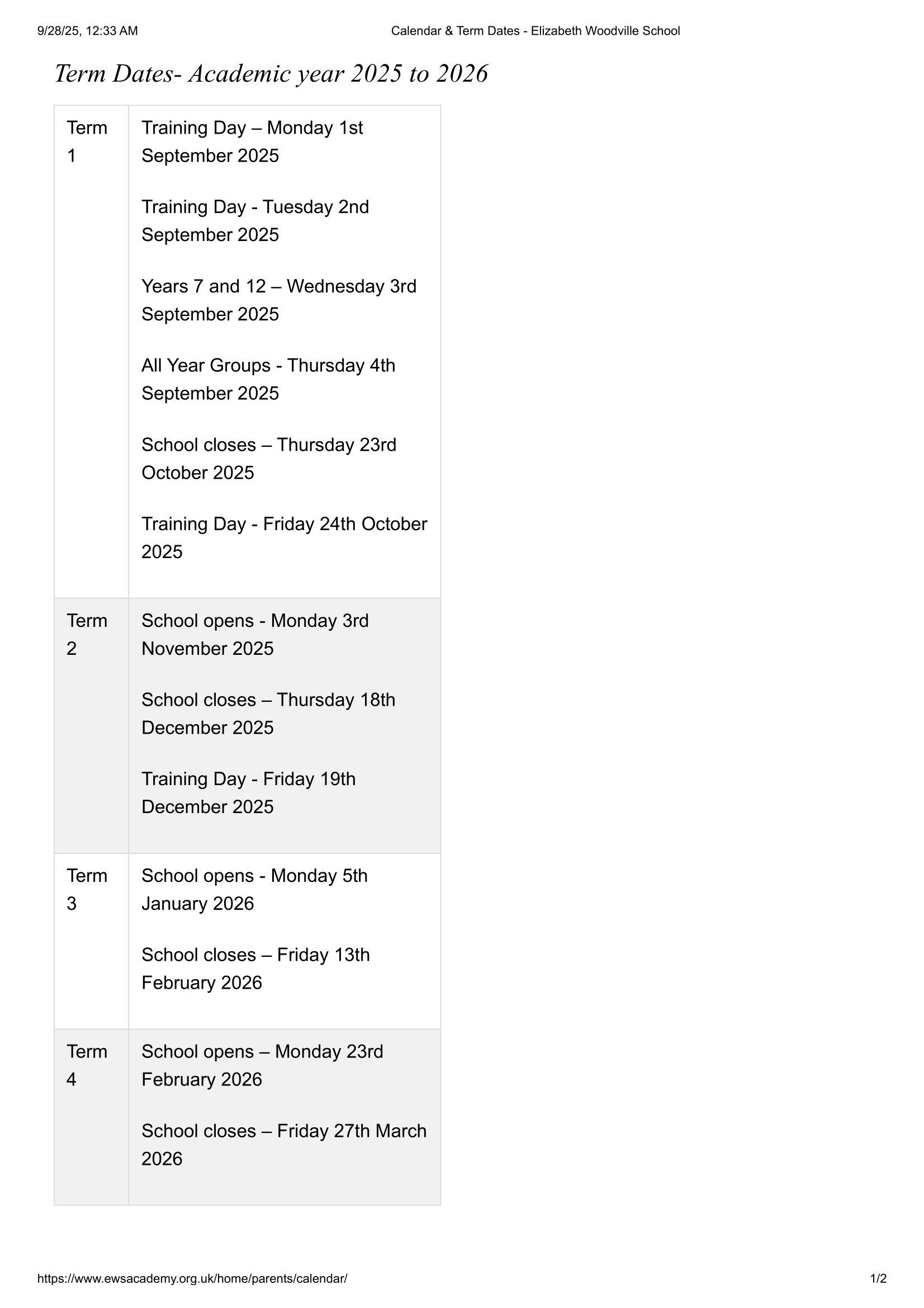 Elizabeth Woodville School Term dates (2025-2026)