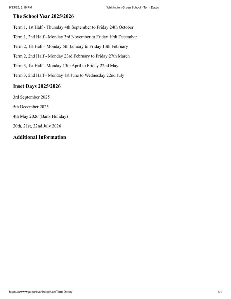 Download PDF View Original Calendar Derbyshire County Council Calendar PDF Get Alerts Whittington Green School Term dates (2025-2026) Whittington Green