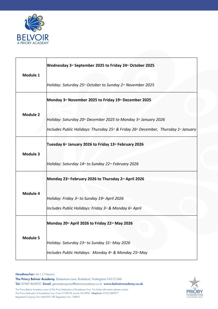 Download PDF View Original Calendar Leicestershire County Council Calendar PDF Get Alerts Belvoir Priory Academy Term dates (2025-2026) Belvoir Priory