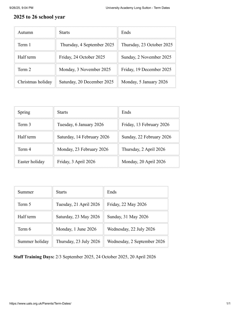 Download PDF View Original Calendar Lincolnshire County Council Calendar PDF Get Alerts University Academy Long Sutton Term dates (2025-2026) University