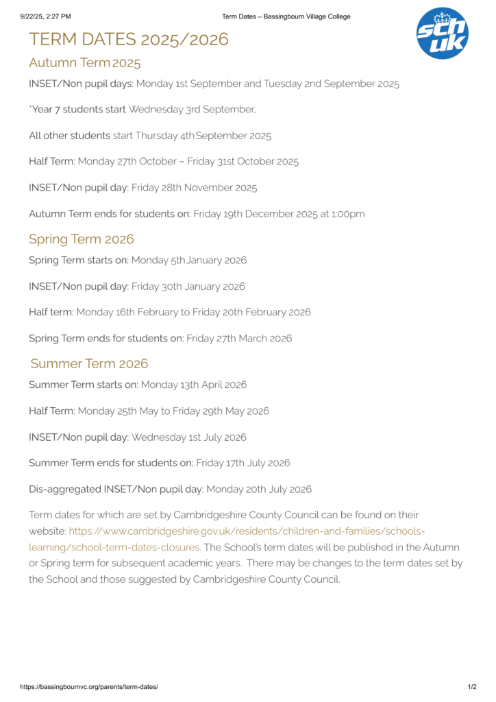 Cambridgeshire, East of England, EnglandCambridge Academy for Science and Technology Term Dates 25-26 Revised [pdf]