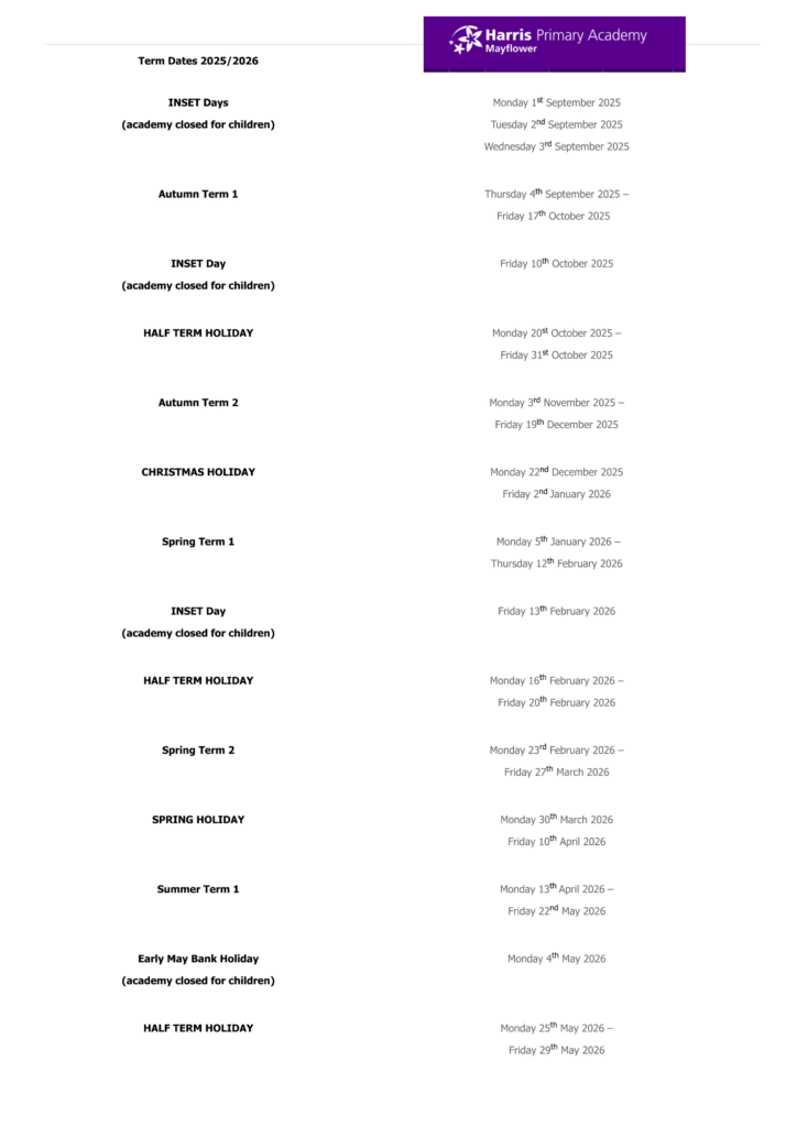 Harris Primary Academy Chafford Term Dates 25-26 updated