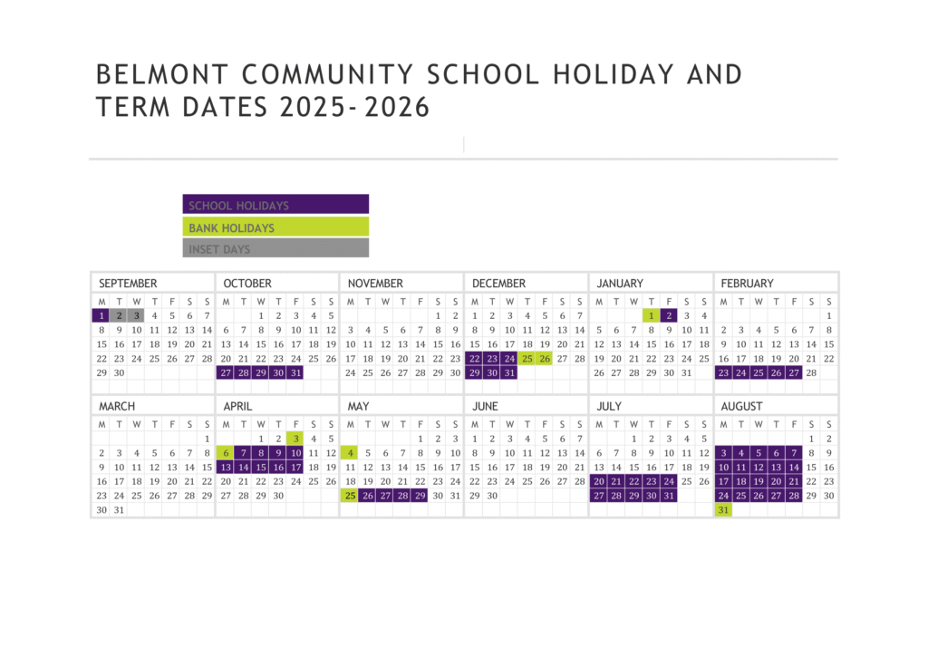 Download PDF View Original Calendar Durham County Council Calendar PDF Get Alerts Belmont Community School Term dates (2025-2026) Belmont Community