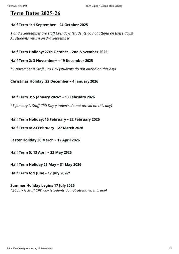 Download PDF View Original Calendar Get Alerts North Yorkshire Council Term Dates Bedale High School Term dates (2025-2026) Bedale High