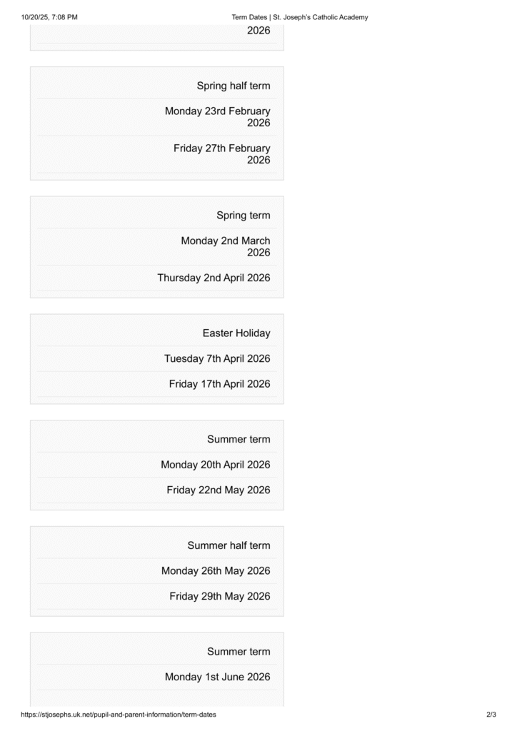 Download PDF View Original Calendar View Original Calendar View Original Calendar Get Alerts St. Joseph’s Catholic Academy Term dates (2025-2026)