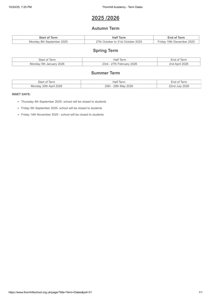 Download PDF View Original Calendar Get Alerts Thornhill Academy Term dates (2025-2026) Thornhill Academy Term dates (2025-2026) Term dates by