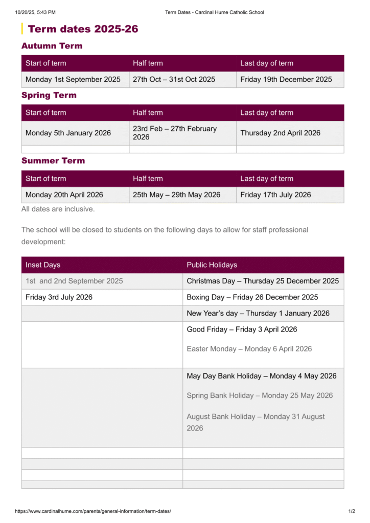 Download PDF View Original Calendar Get Alerts Cardinal Hume Catholic School Term dates (2025-2026) Cardinal Hume Catholic School Term dates