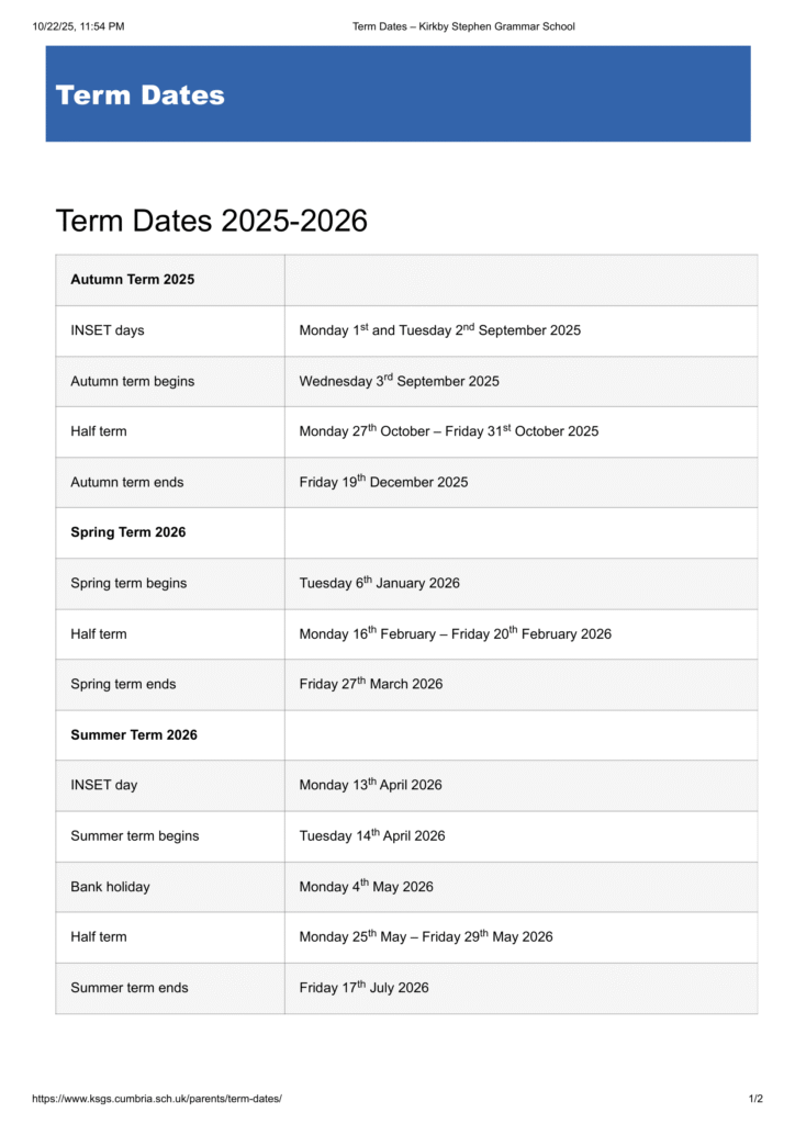 Kirkbie Kendal School Term Dates 25-26 Official Update
