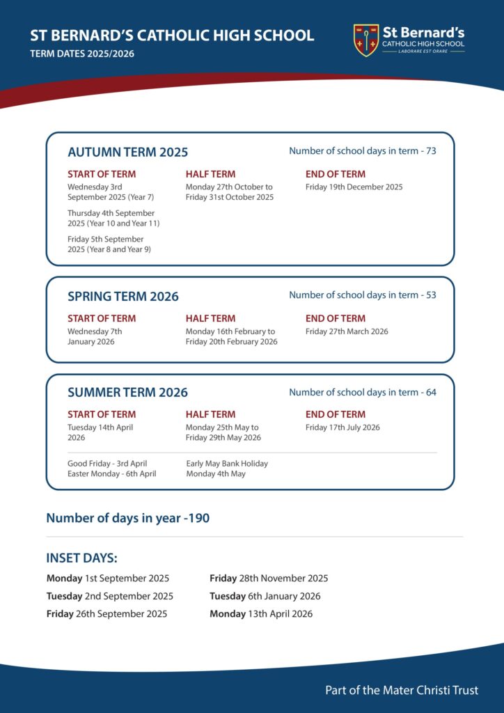 St Bernard’s Catholic High School Term Dates 25-26 Official Update