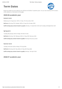 The school Term Dates shown on this page has been sourced directly from the official ## term dates website. Please be aware that all dates and events may be amended at the discretion of the school or local council. For the most up-to-date and accurate information, we recommend checking the official council website or contacting the school office.