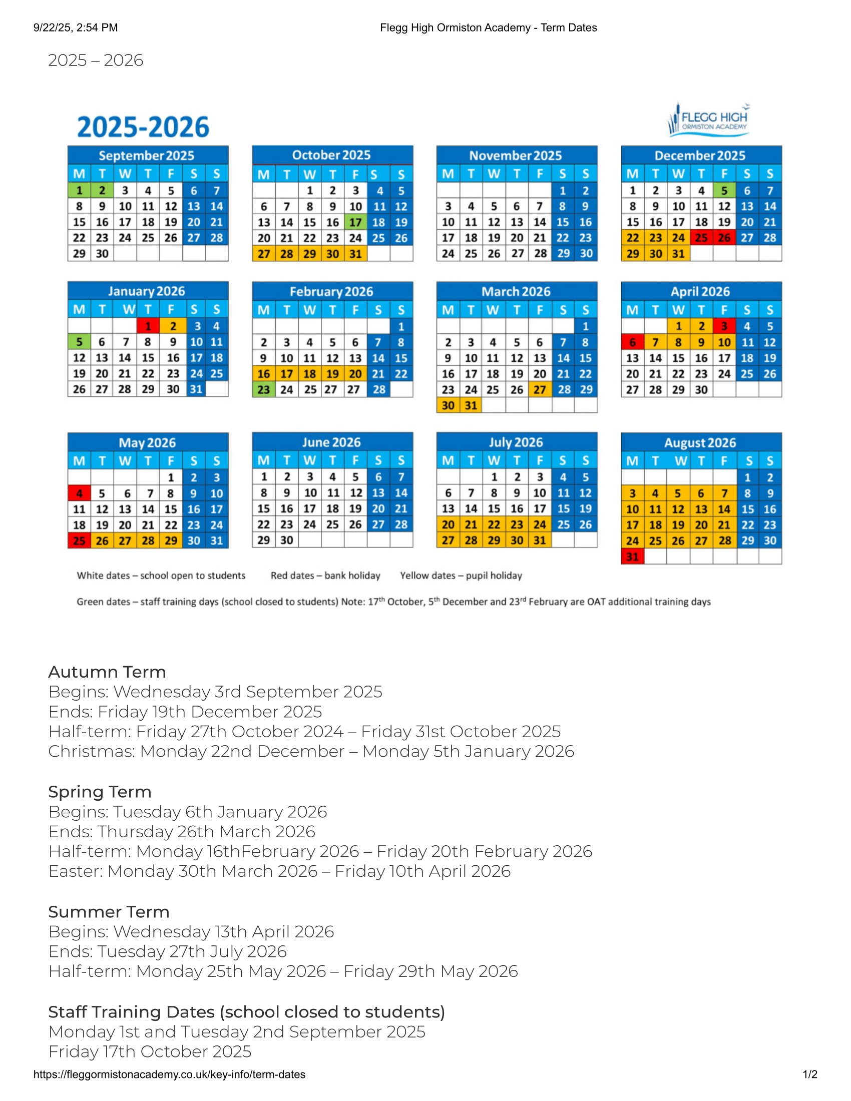 Flegg High Ormiston Academy Term dates (2025-2026)