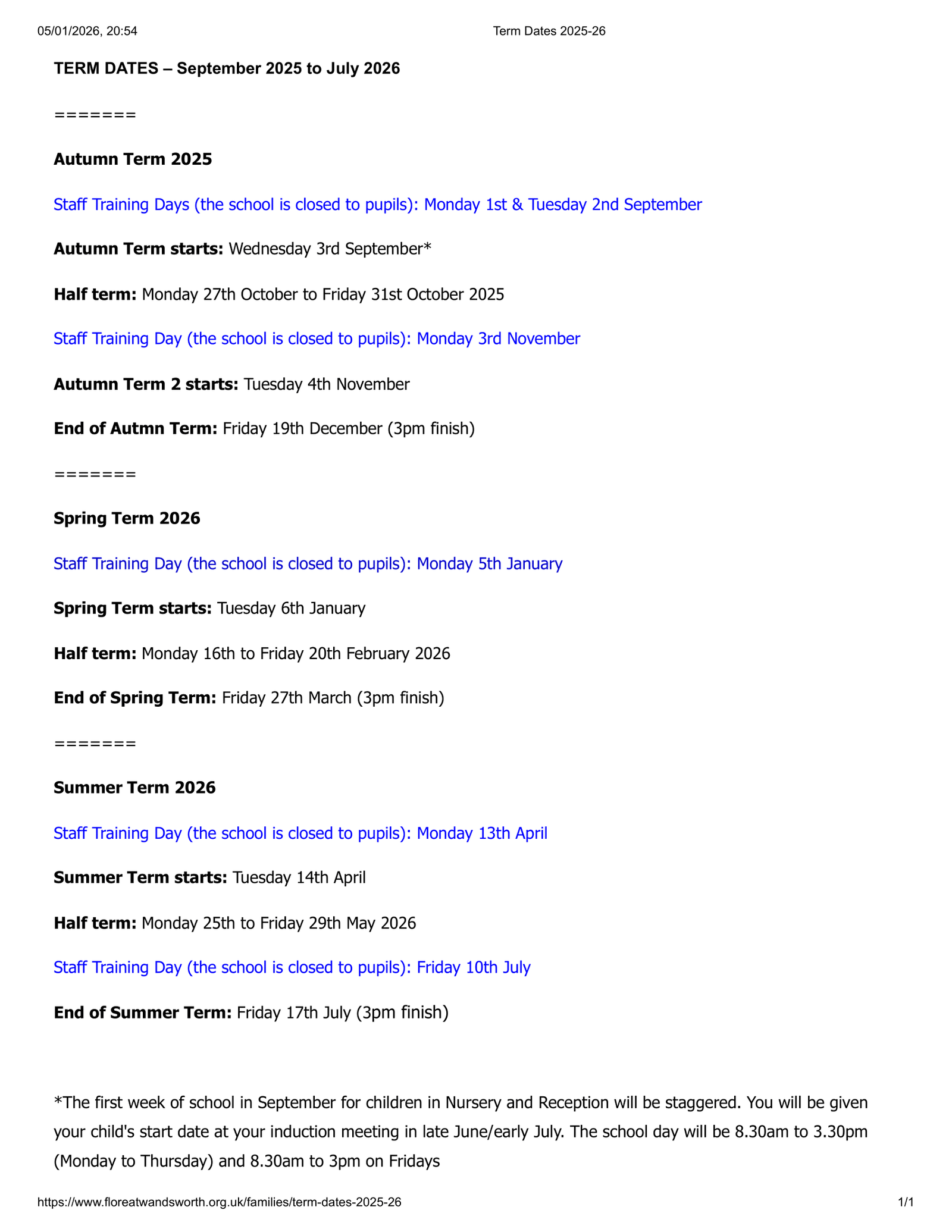 The school Term Dates shown on this page has been sourced directly from the official Floreat Wandsworth term dates 25-26 Official Updates website. Please be aware that all dates and events may be amended at the discretion of the school or local council. For the most up-to-date and accurate information, we recommend checking the official council website or contacting the school office.