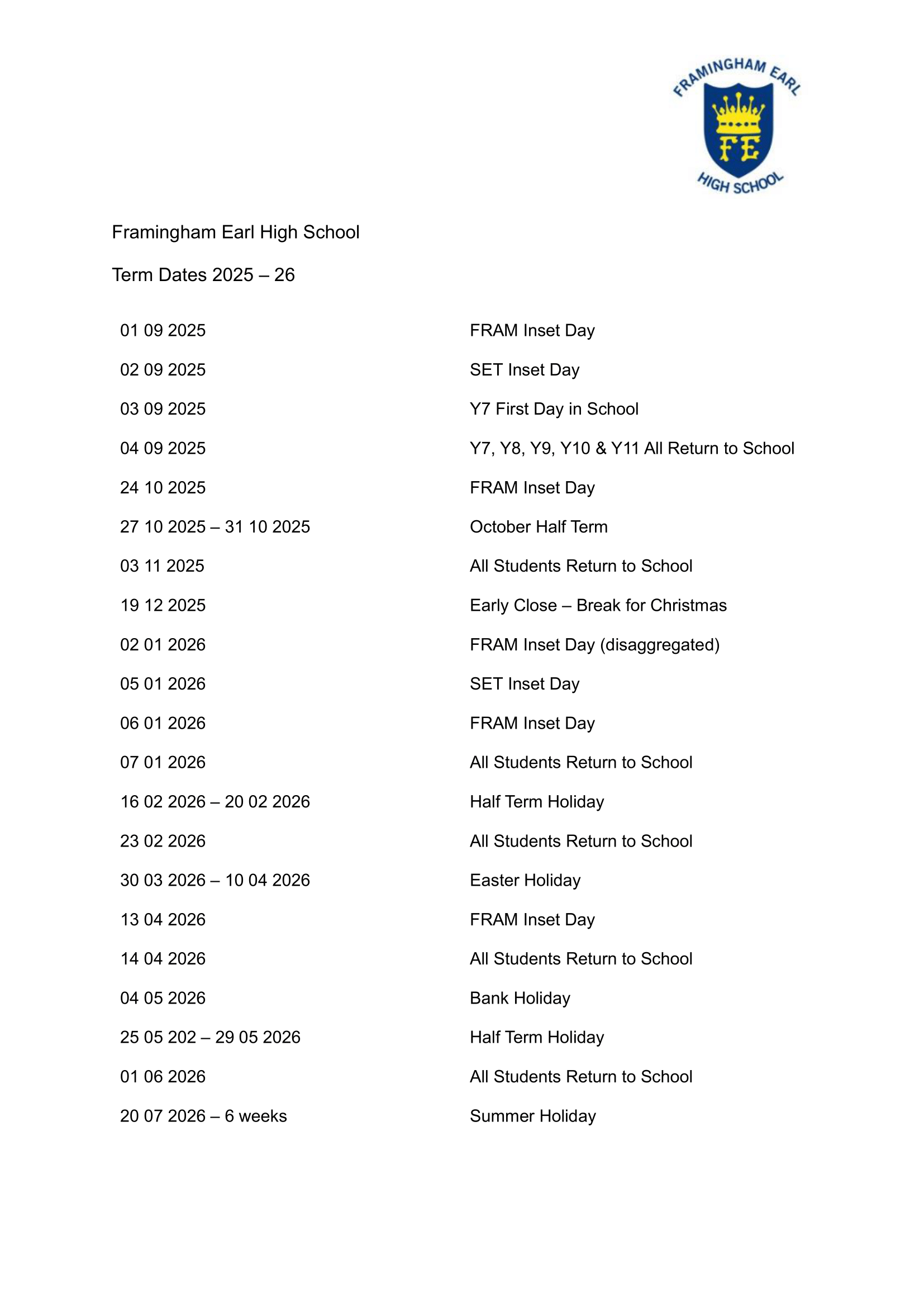 Framlingham Earl High School 25-26 Term date revised [pdf]