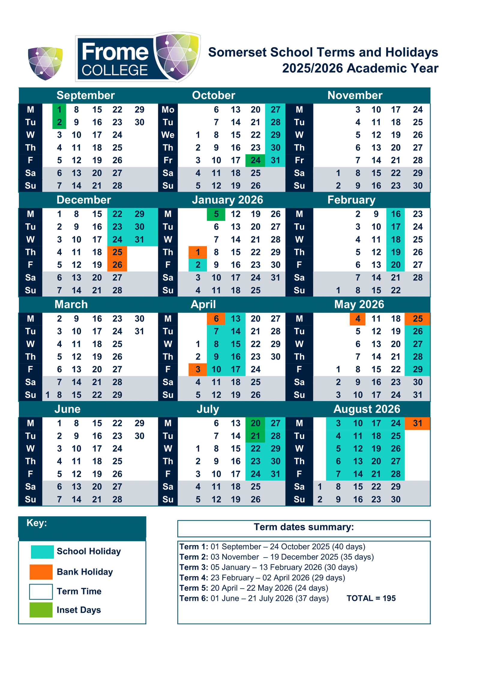 There are a total of 195 school days in the 2025–2026 academic year at Frome College.