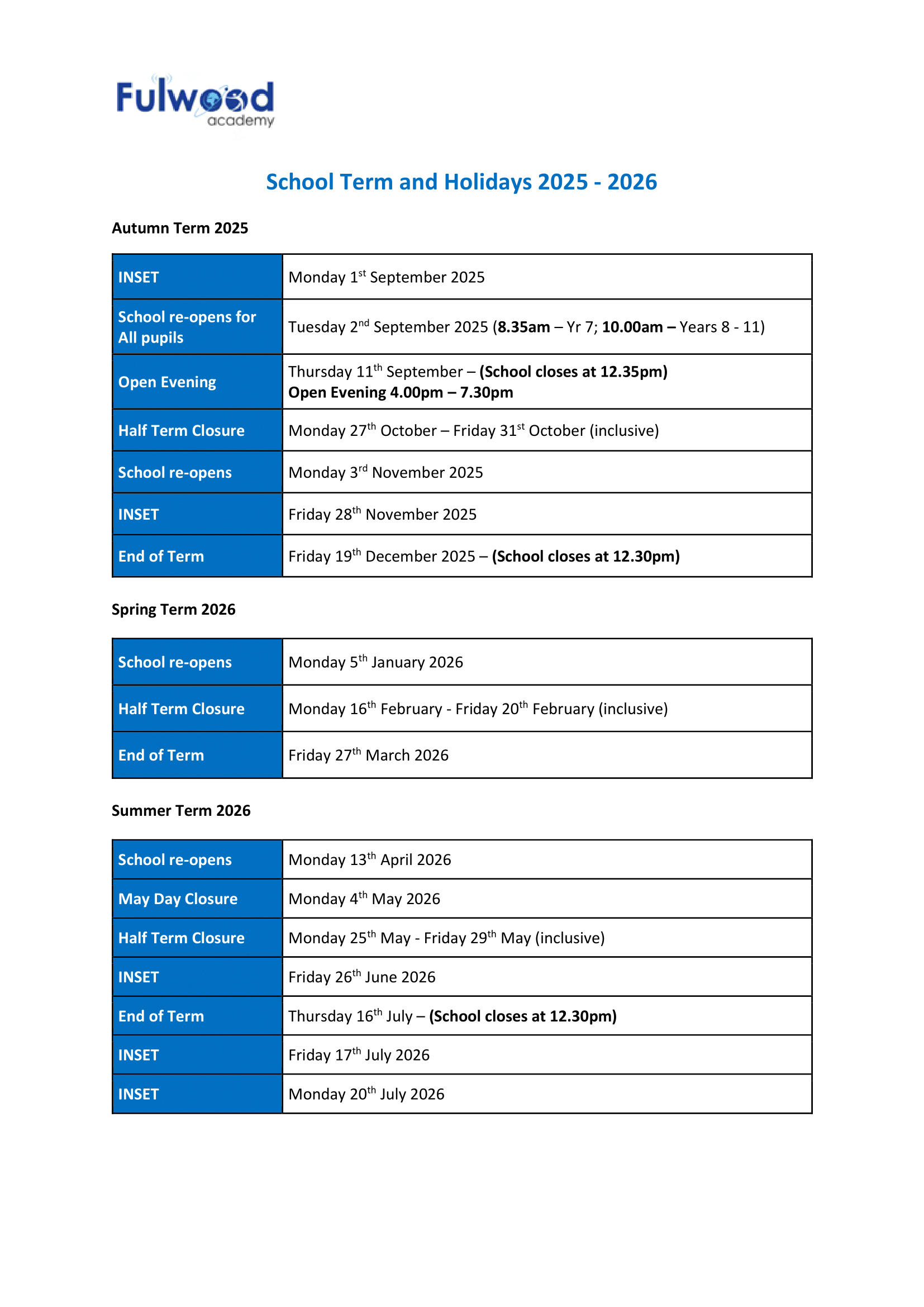 The school Term Dates shown on this page has been sourced directly from the official Fulwood Academyl Term Dates 25-26 Official Update website. Please be aware that all dates and events may be amended at the discretion of the school or local council. For the most up-to-date and accurate information, we recommend checking the official council website or contacting the school office.