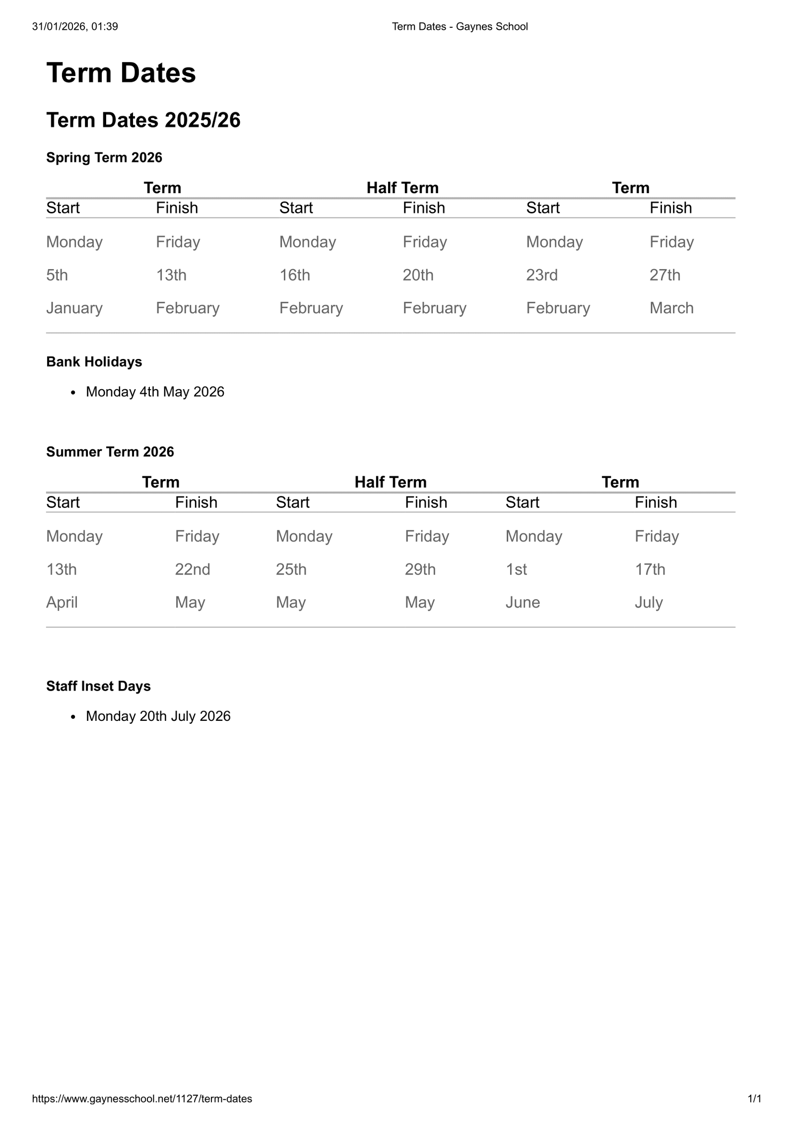 The school Term Dates shown on this page has been sourced directly from the official Gaynes School 25-26 Term Dates Revised website. Please be aware that all dates and events may be amended at the discretion of the school or local council. For the most up-to-date and accurate information, we recommend checking the official council website or contacting the school office.
