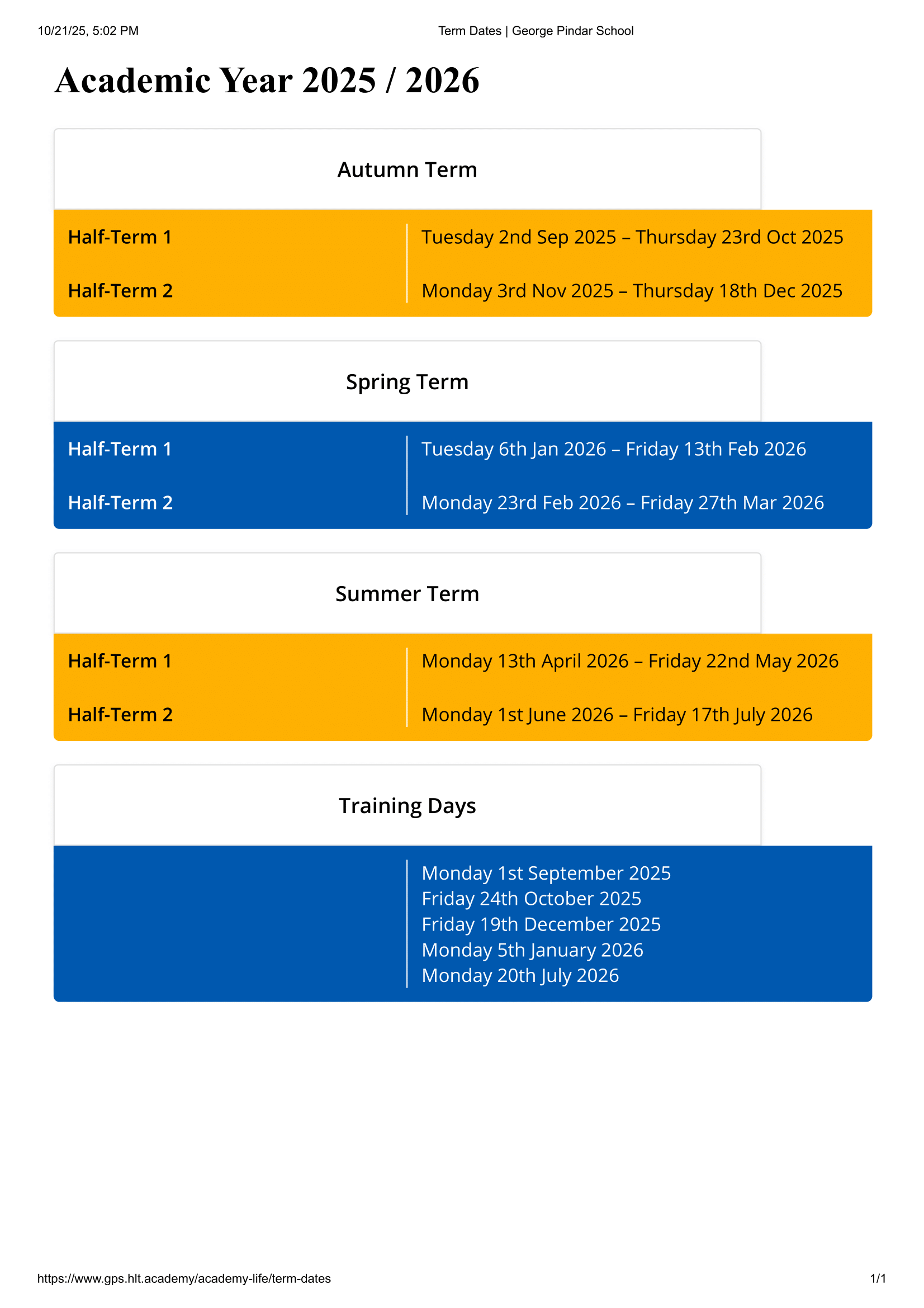The school Term Dates shown on this page has been sourced directly from the official George Pindar School north yorkshire term dates website. Please be aware that all dates and events may be amended at the discretion of the school or local council. For the most up-to-date and accurate information, we recommend checking the official council website or contacting the school office.