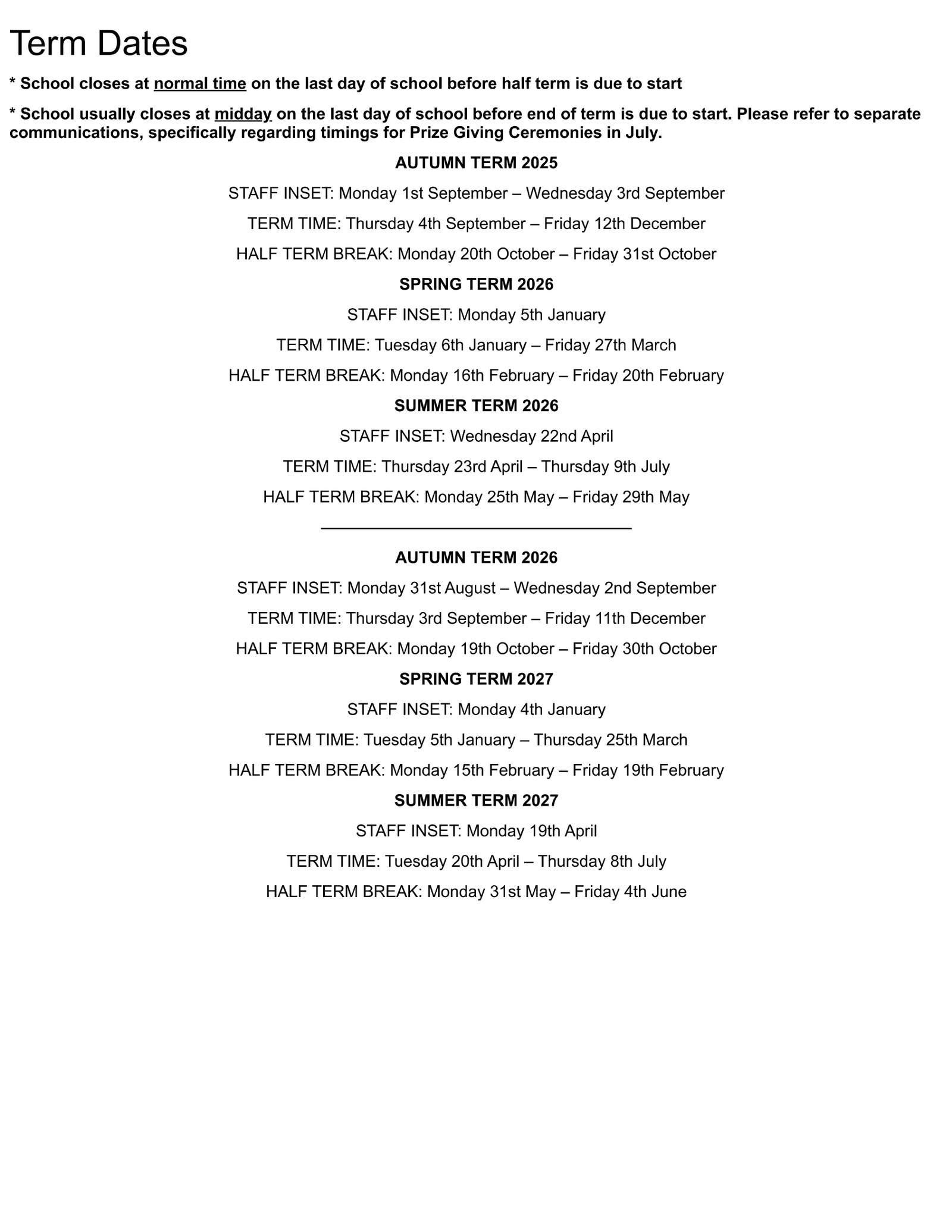| Apr 22, 2026 | Summer Term 2026 Staff Inset |