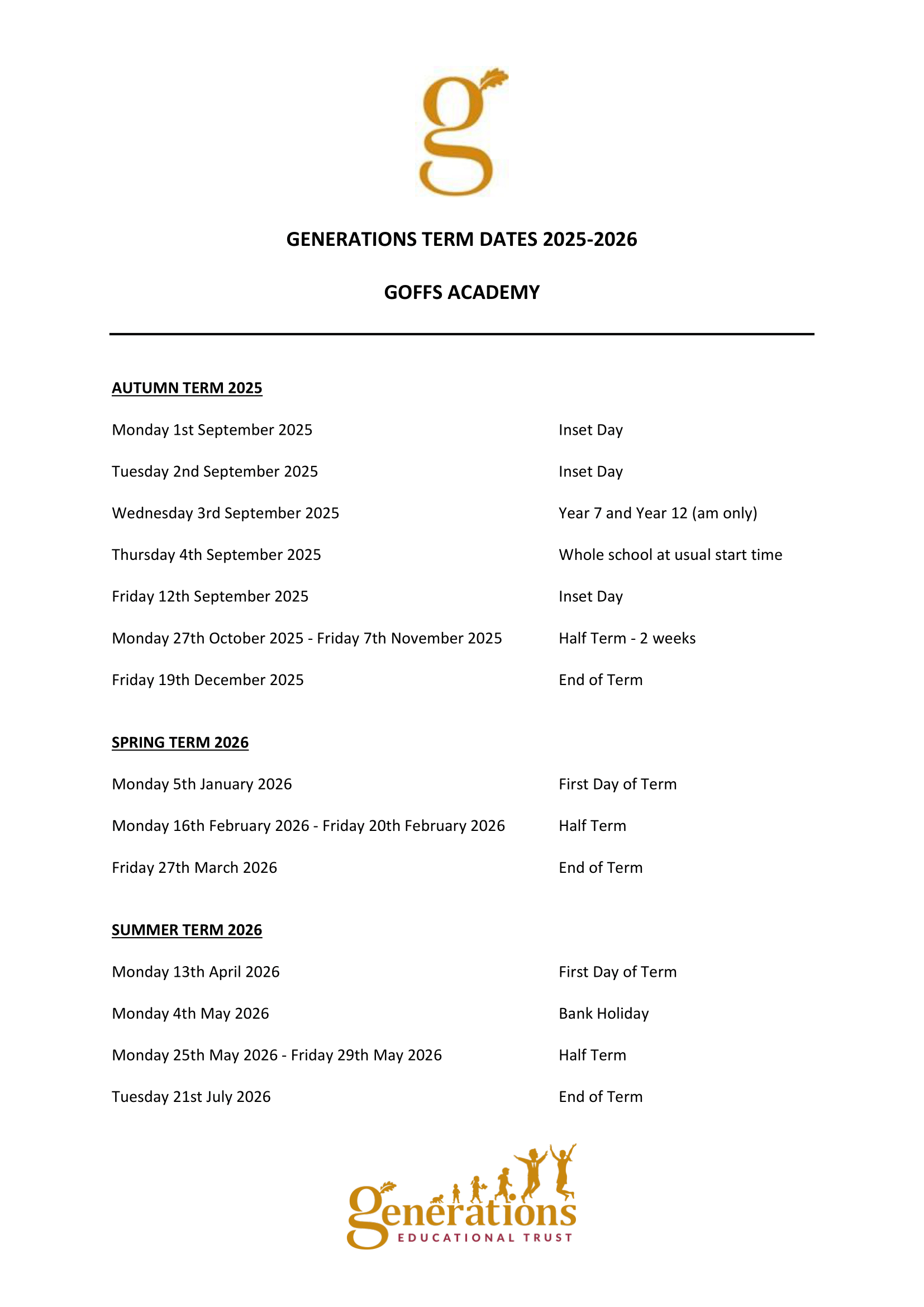- All dates above are taken directly from the Goffs Academy 2025–2026 calendar.