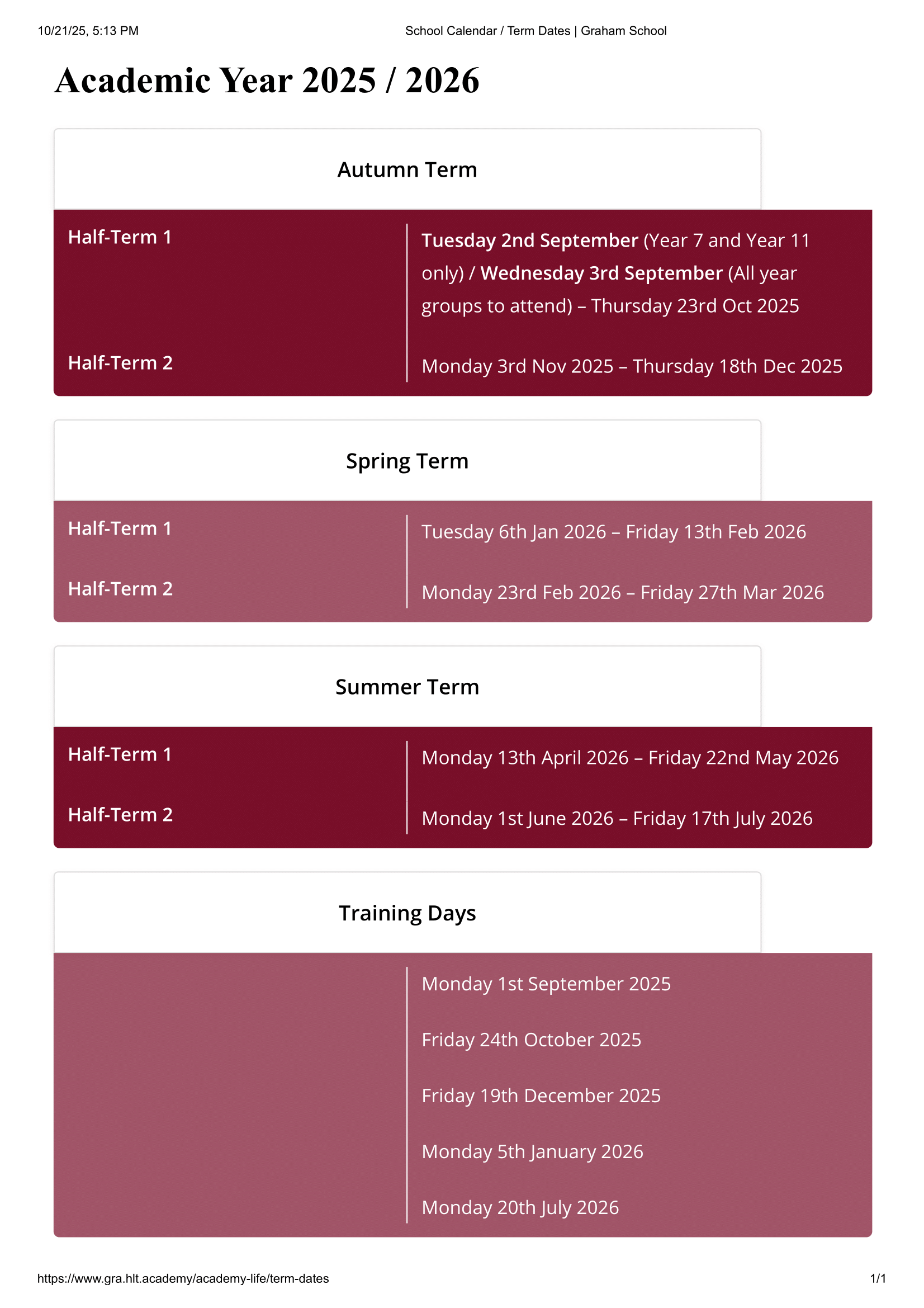 The school Term Dates shown on this page has been sourced directly from the official Graham School north yorkshire term dates website. Please be aware that all dates and events may be amended at the discretion of the school or local council. For the most up-to-date and accurate information, we recommend checking the official council website or contacting the school office.