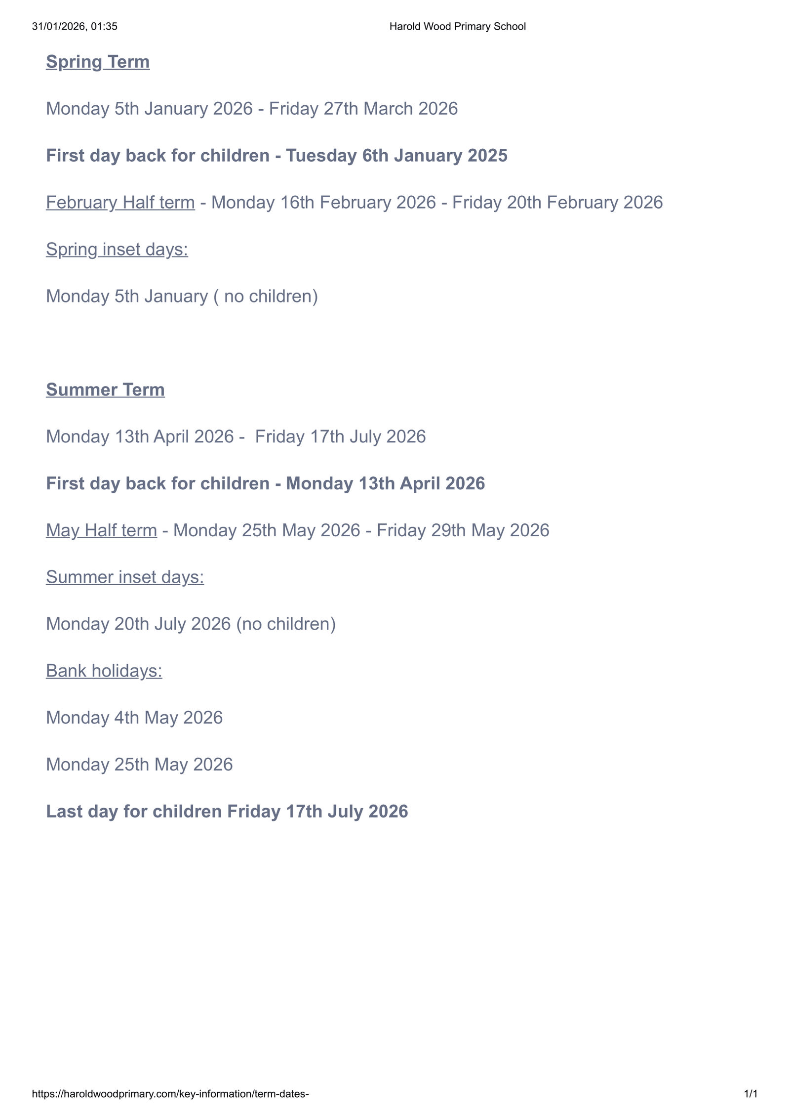 The school Term Dates shown on this page has been sourced directly from the official Harold Wood Primary School 25-26 Term Dates Revised website. Please be aware that all dates and events may be amended at the discretion of the school or local council. For the most up-to-date and accurate information, we recommend checking the official council website or contacting the school office.