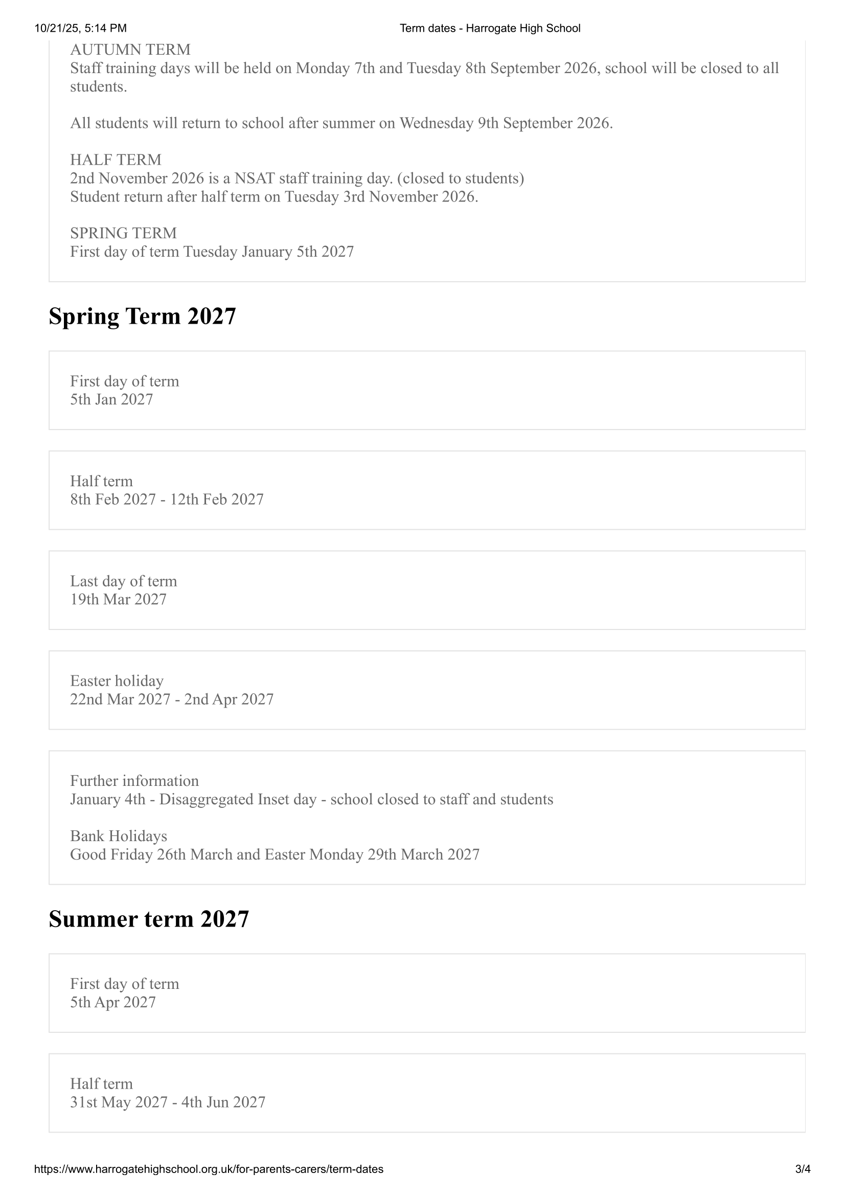 - 26th Jul 2027 – Disaggregated inset day (school closed to staff and students).