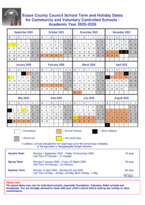 Source calendar shows Essex County Council term blocks and legend for: school days, school holidays, bank holidays, weekends, and non-pupil days.