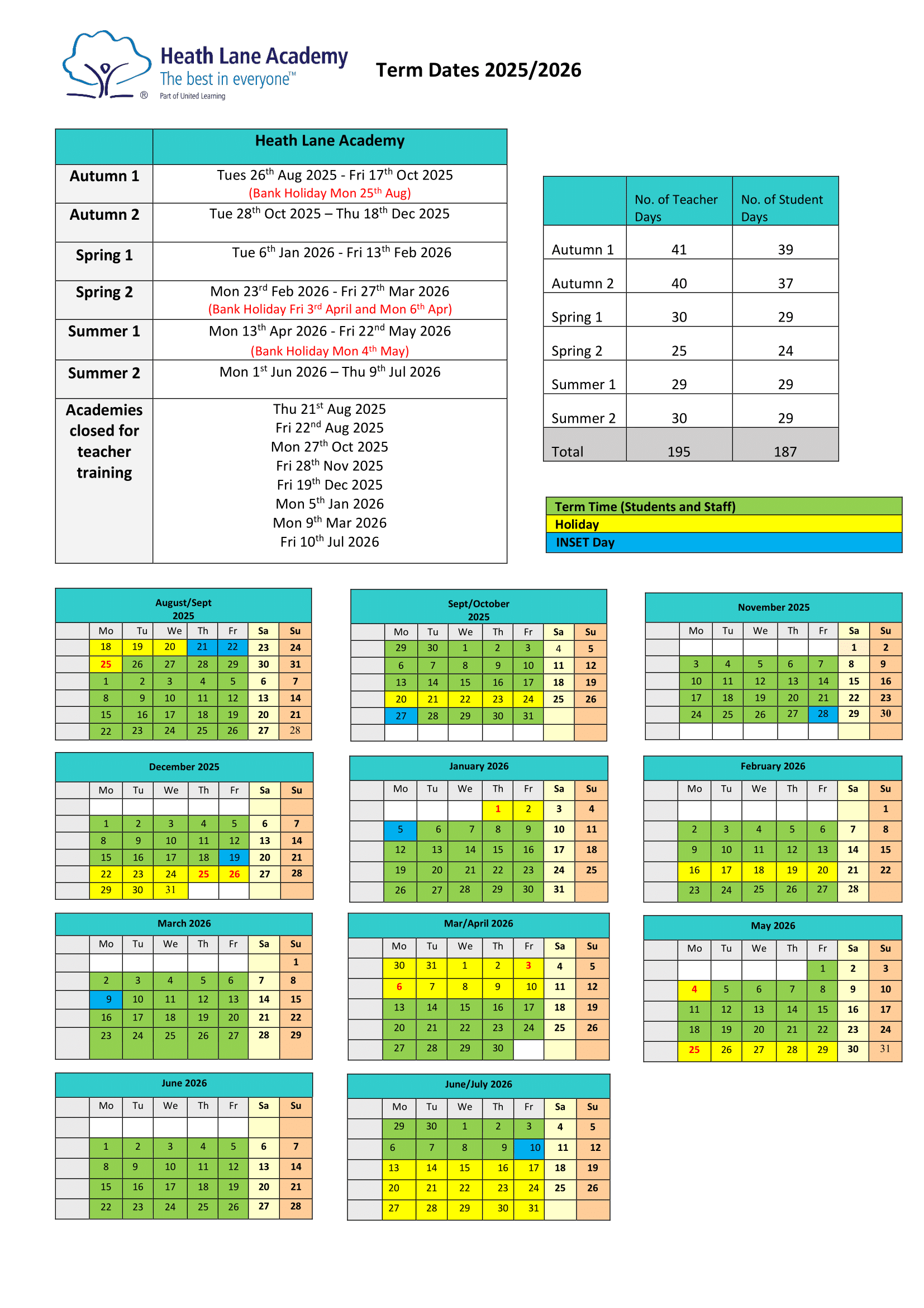 The dates below are taken directly from the official Heath Lane Academy calendar for 2025–2026.
