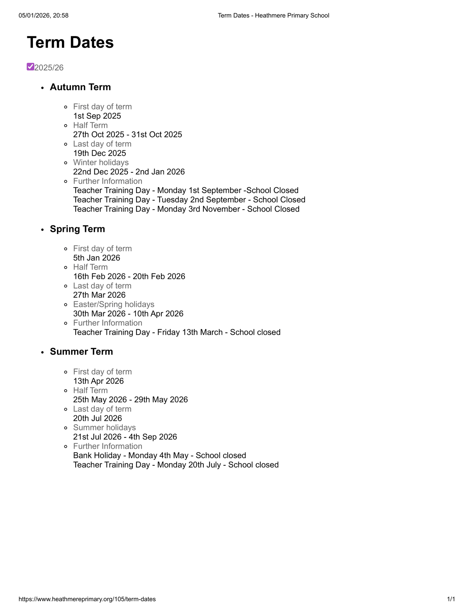Heathmere Primary School Term Dates 2025–2026