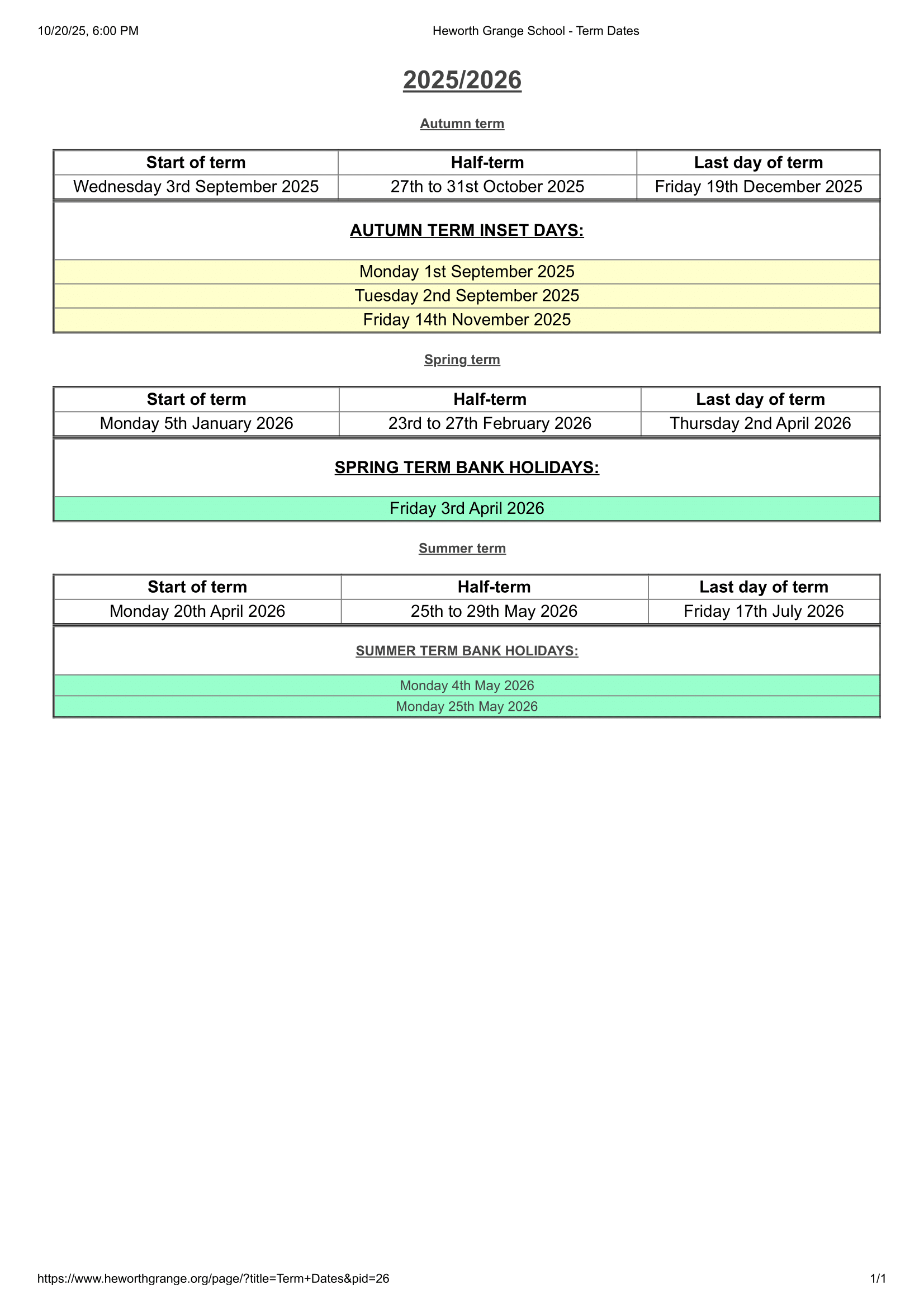 Heworth Grange School Term dates (2025-2026)
