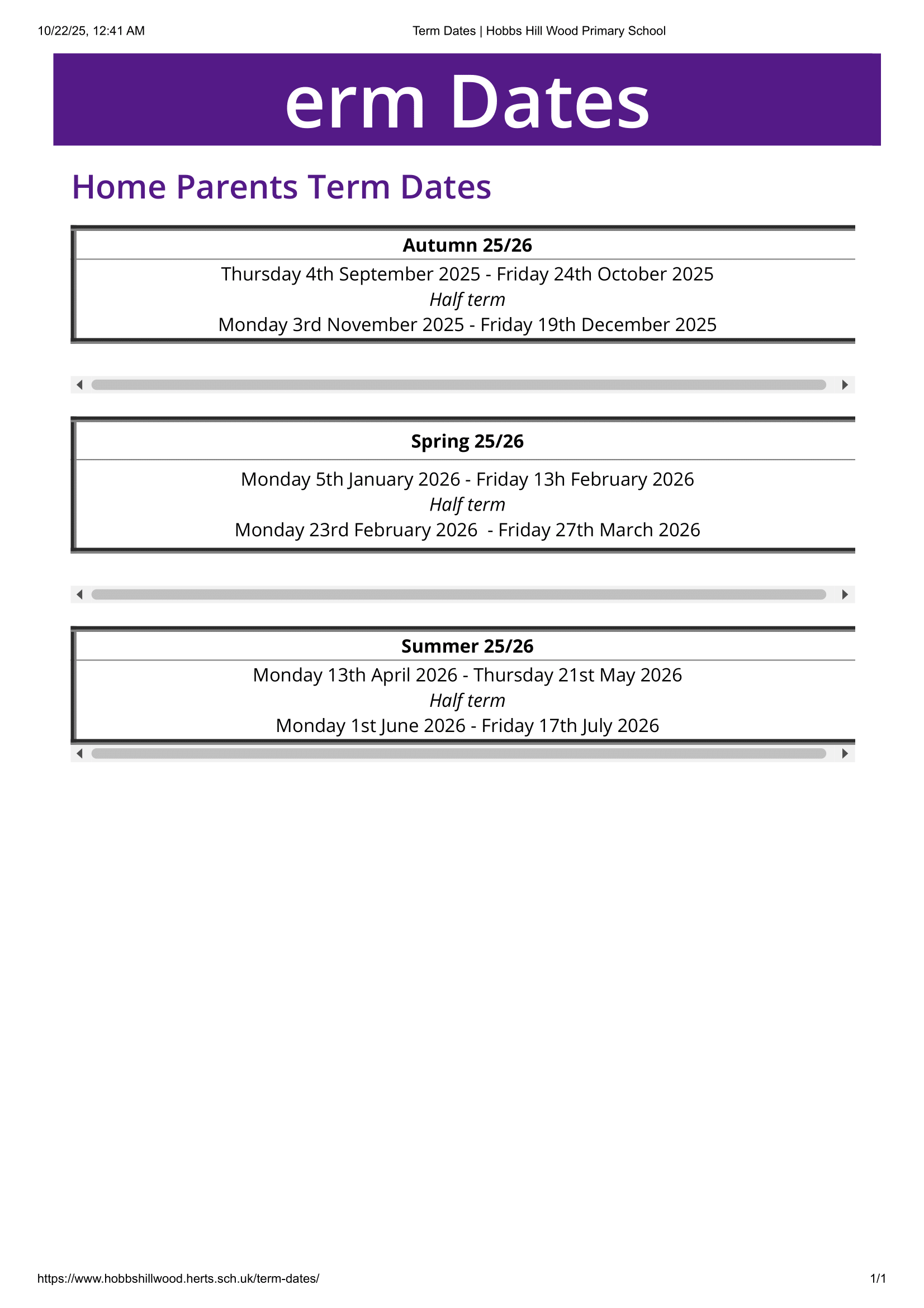 Hobbs Hill Wood Primary School Term dates (2025-2026)