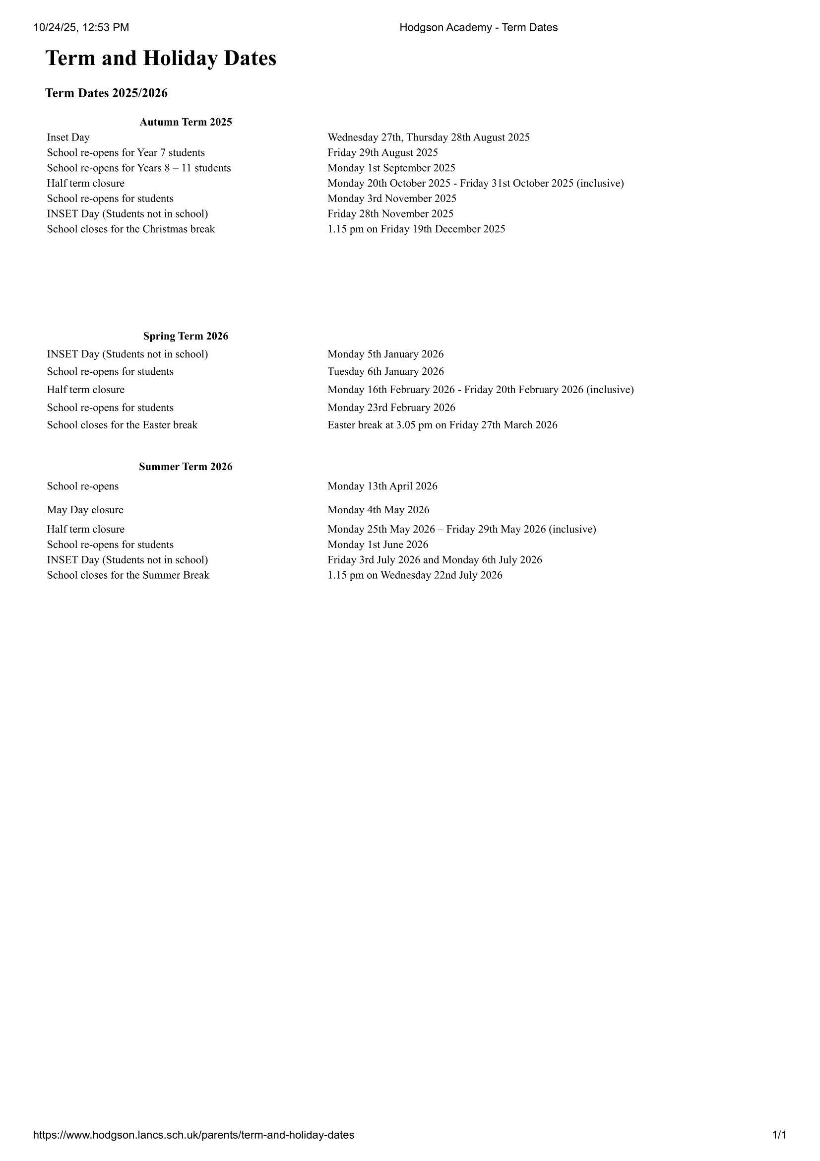 Hodgson Academy — Term Dates & FAQs (2025–2026)