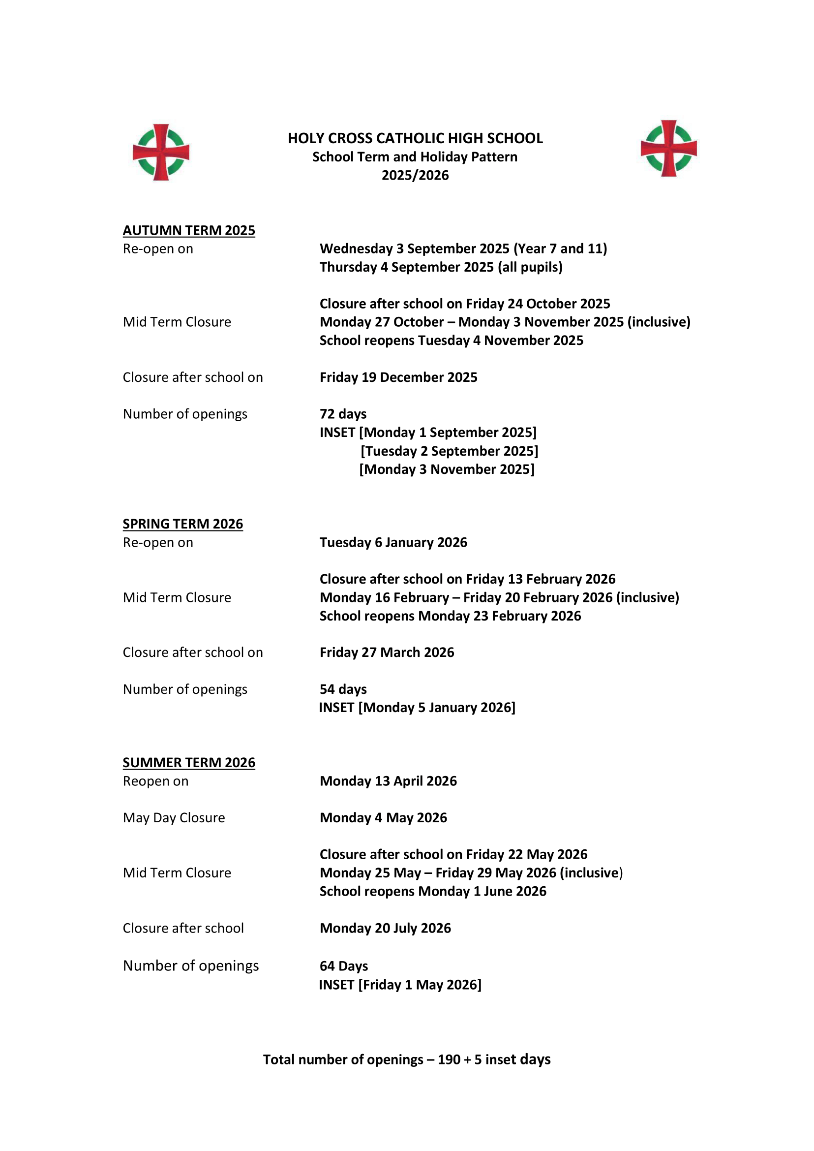 The school Term Dates shown on this page has been sourced directly from the official Holy Cross Catholic High School Term Dates 25-26 Official Update website. Please be aware that all dates and events may be amended at the discretion of the school or local council. For the most up-to-date and accurate information, we recommend checking the official council website or contacting the school office.