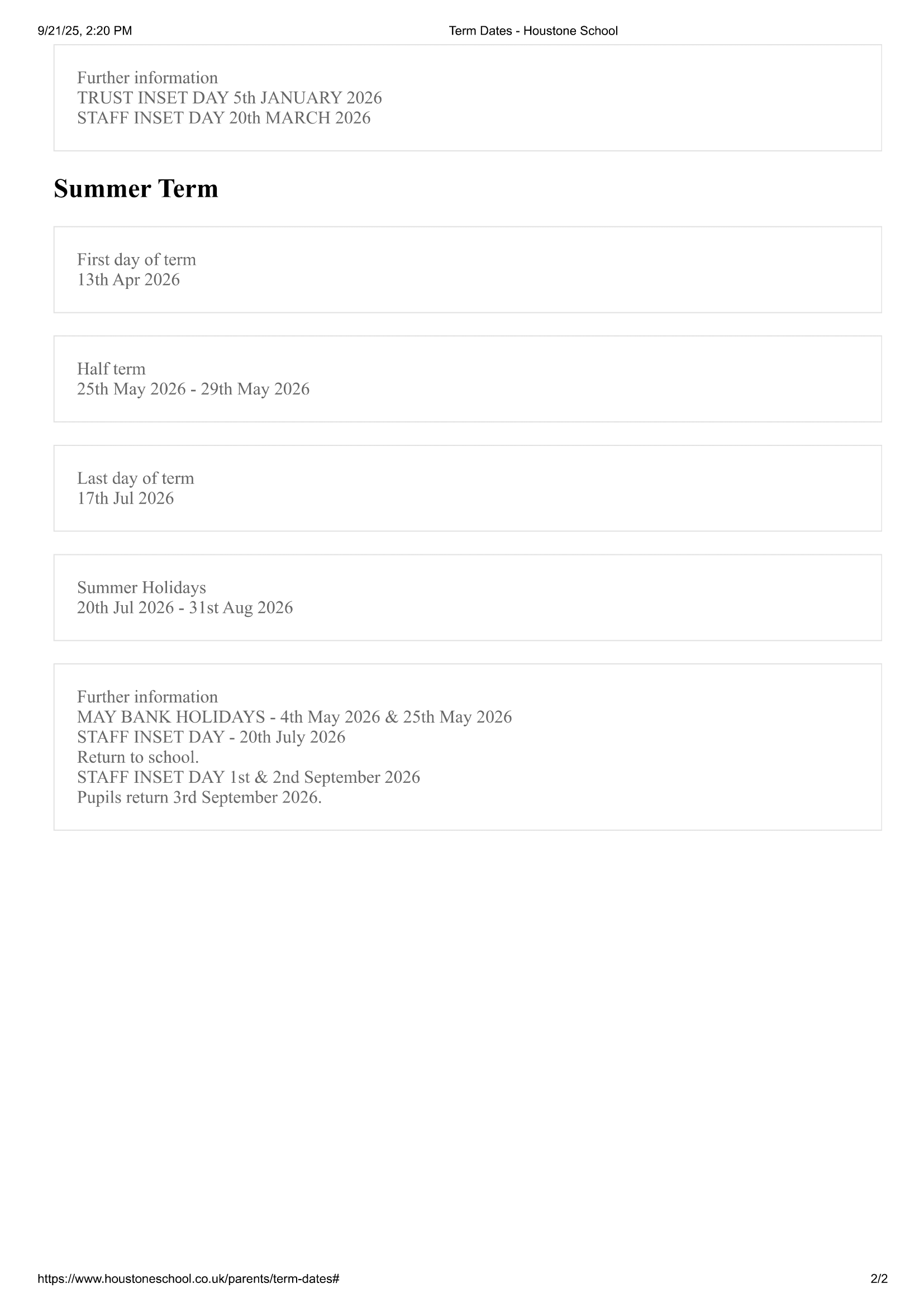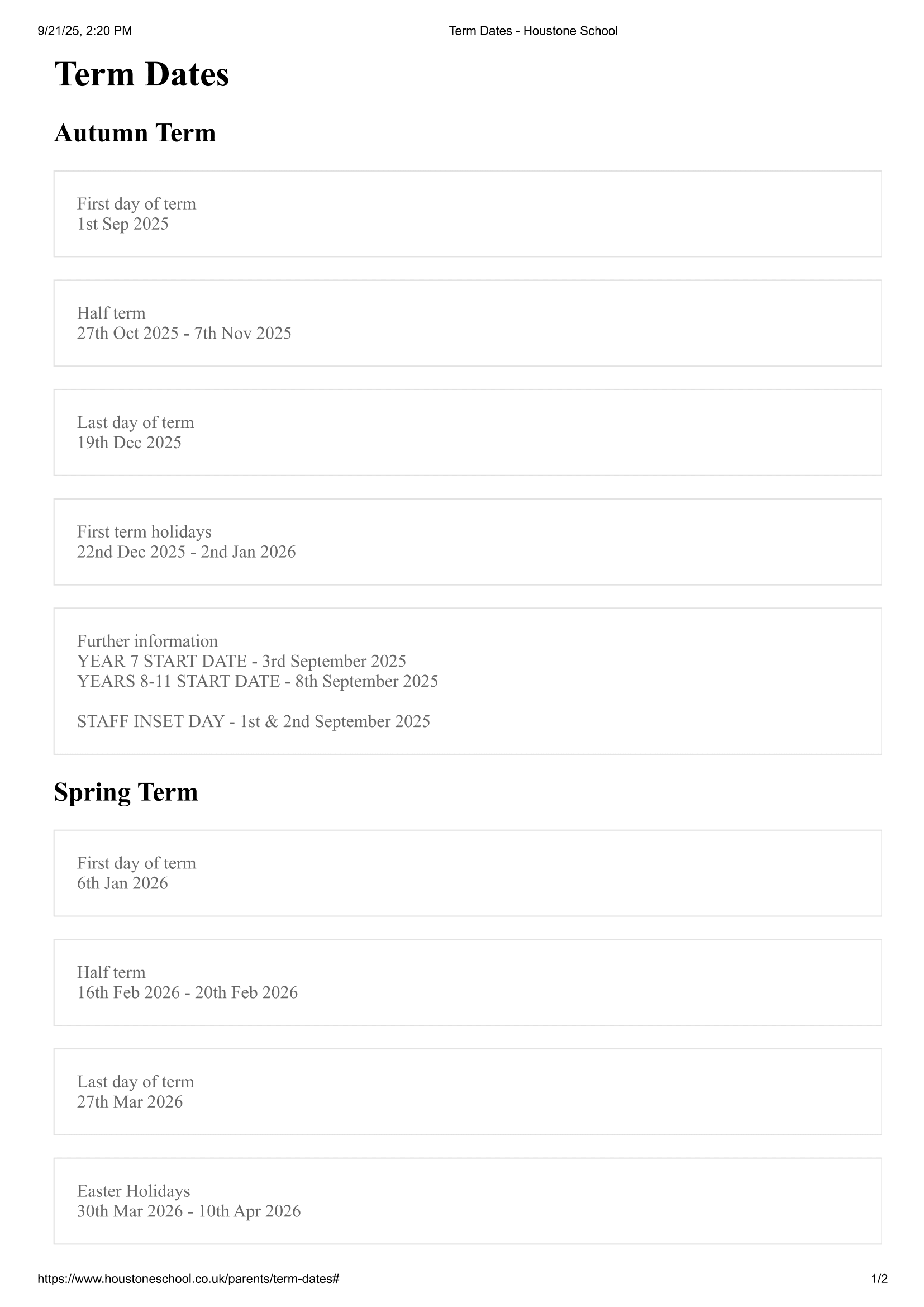 The school Term Dates shown on this page has been sourced directly from the official Houstone School term dates website. Please be aware that all dates and events may be amended at the discretion of the school or local council. For the most up-to-date and accurate information, we recommend checking the official council website or contacting the school office.