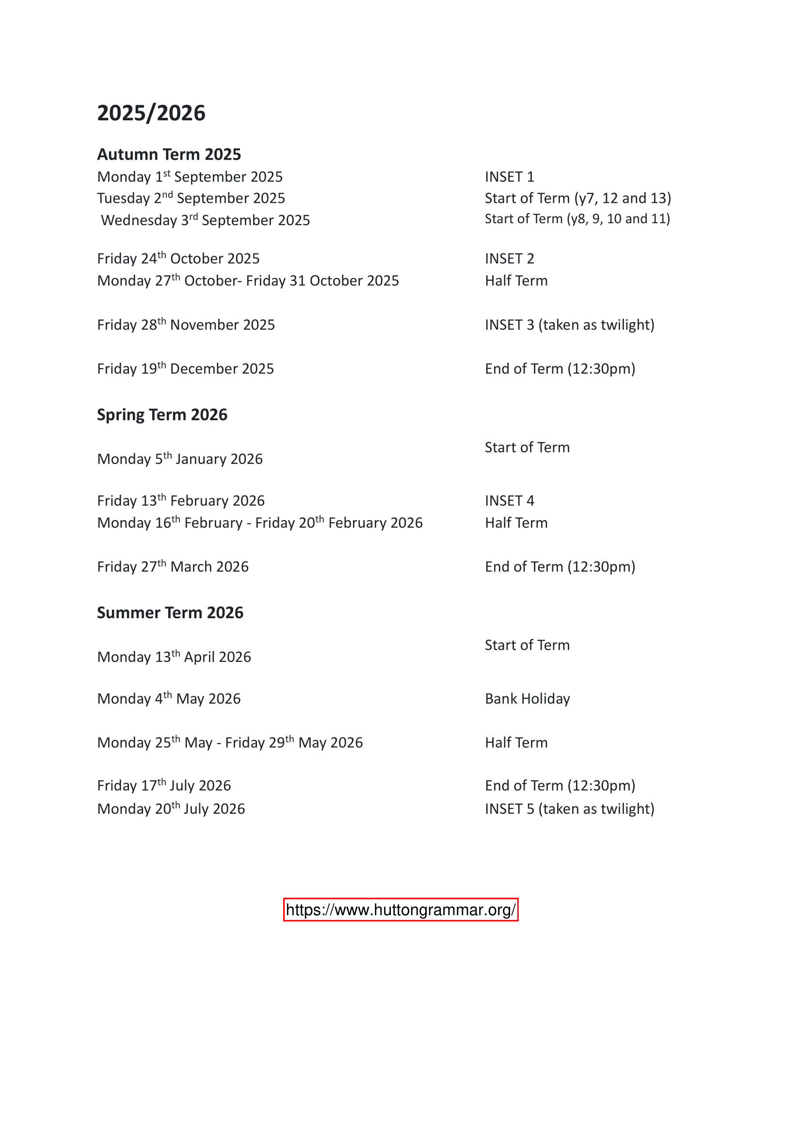 The school Term Dates shown on this page has been sourced directly from the official Hutton Grammar School Term Dates 25-26 Official Updates website. Please be aware that all dates and events may be amended at the discretion of the school or local council. For the most up-to-date and accurate information, we recommend checking the official council website or contacting the school office.