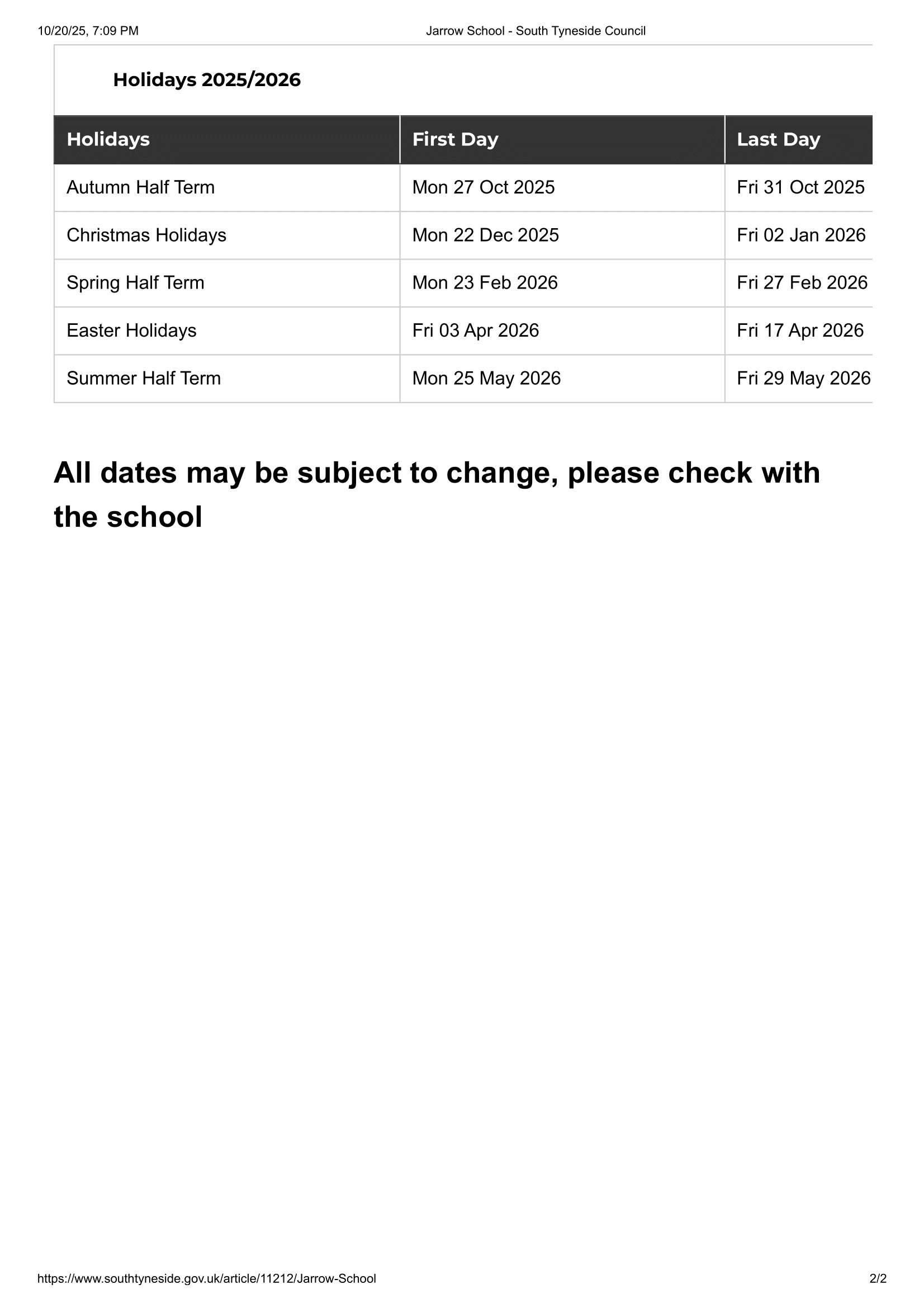 Jarrow School Term Dates 25-26 Revised