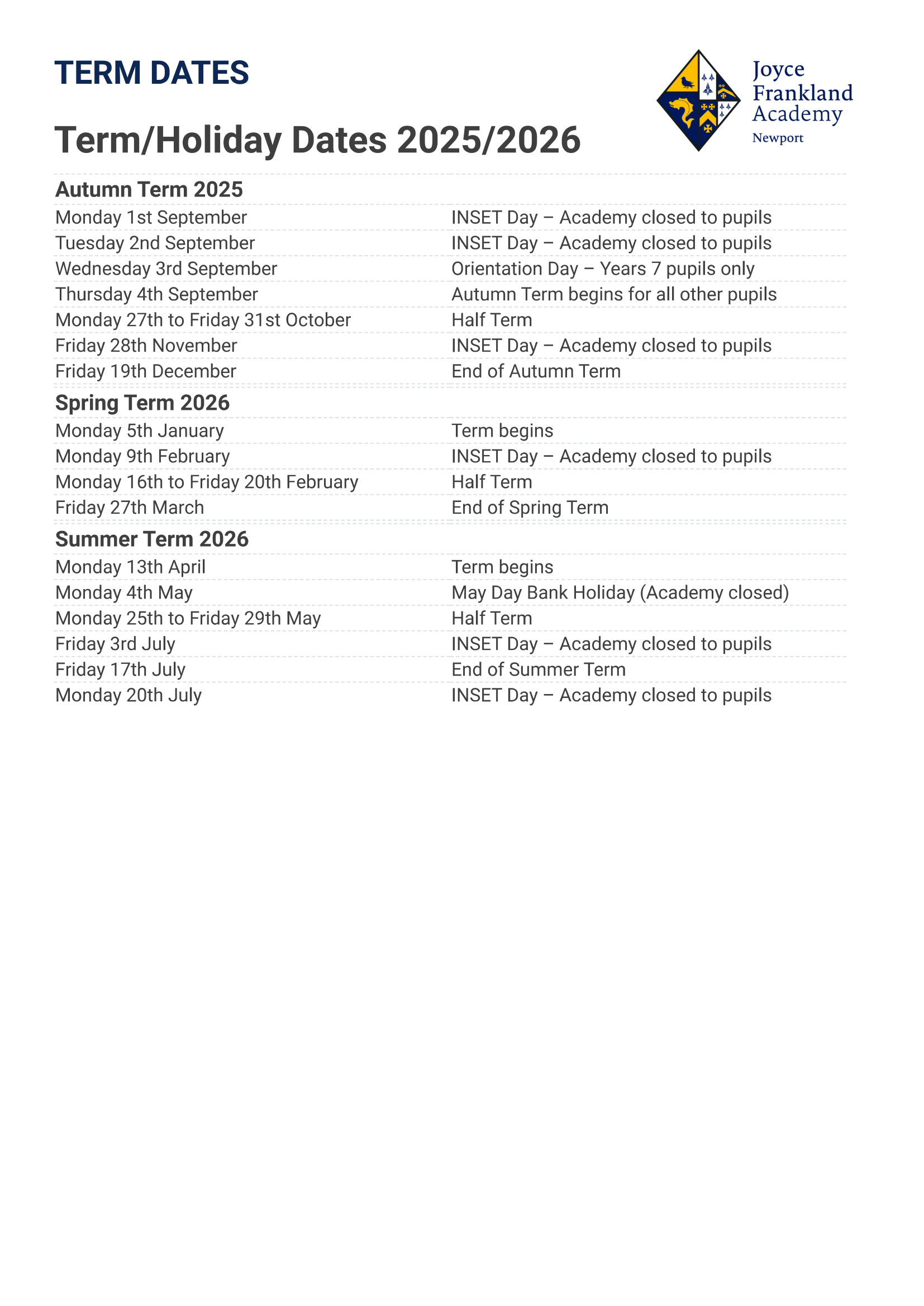 Joyce Frankland Academy — Term Dates FAQ 2024–2025