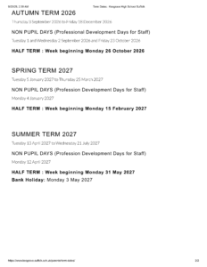 Other important dates (Inset / Non-Pupil Days) 2026–2027