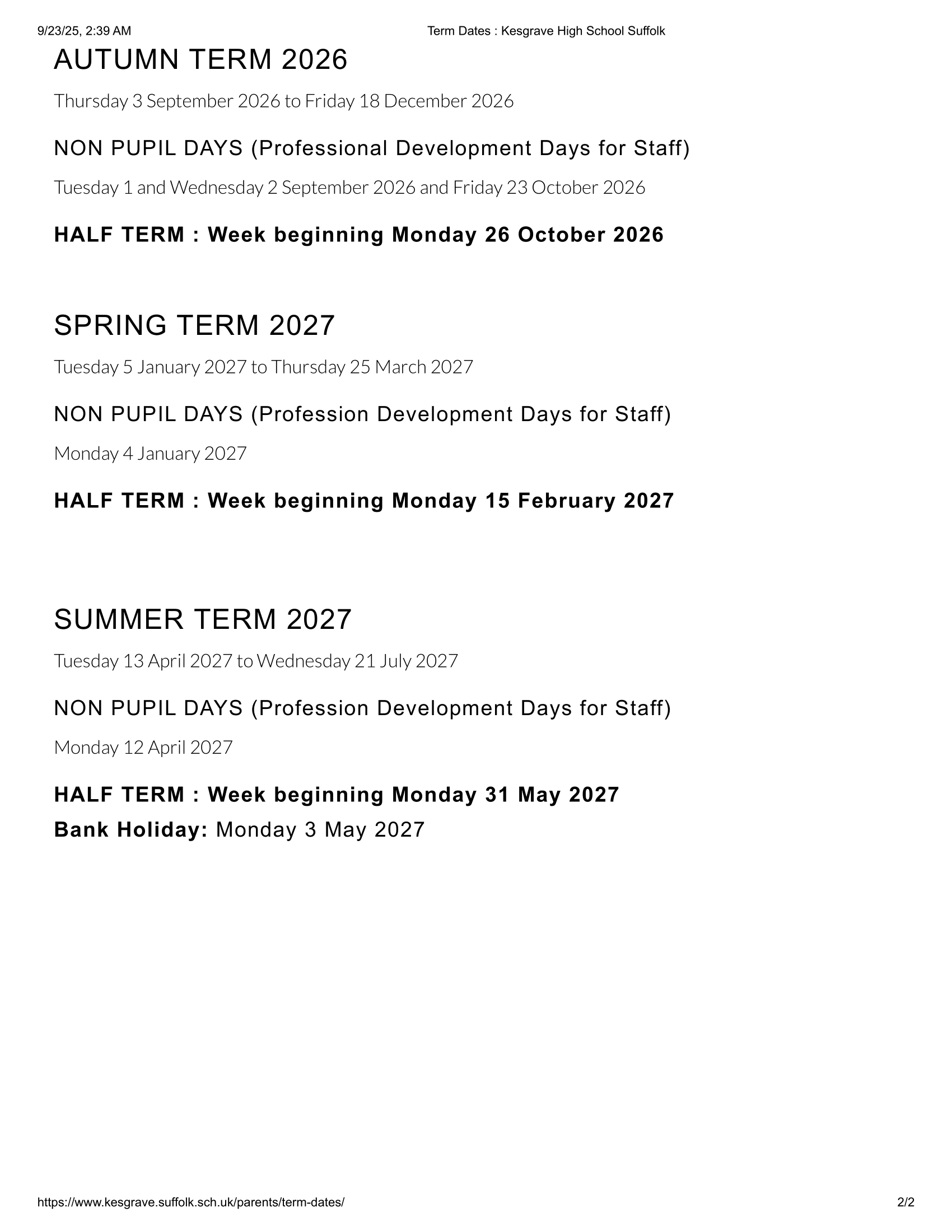 Kesgrave High School Suffolk Term dates (2025-2026)