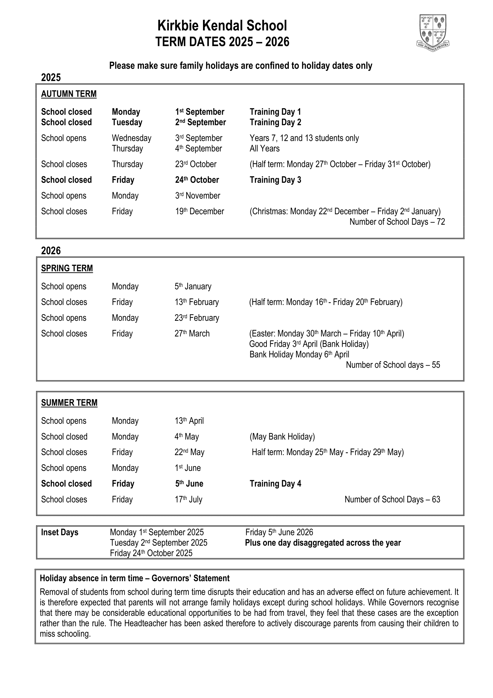 The Autumn Term runs from Wednesday 3rd September 2025 to Friday 19th December 2025. Training days take place on 1st, 2nd, and 24th October 2025.